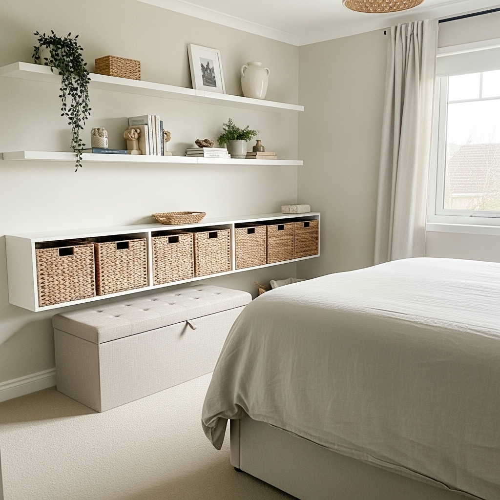 Clutter can disrupt the peaceful vibe of your bedroom. Choose stylish storage options like woven baskets, ottomans with hidden compartments, or floating shelves to keep your space tidy and beautiful.