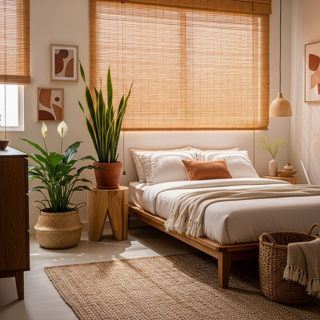 Nature-inspired touches instantly elevate your bedroom’s serenity. From lush plants to wooden textures, bringing the outdoors in creates a grounding, peaceful atmosphere.