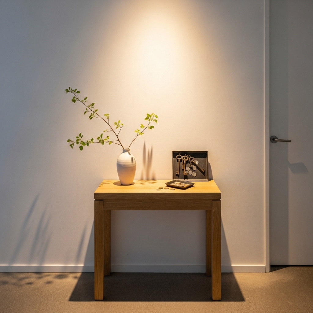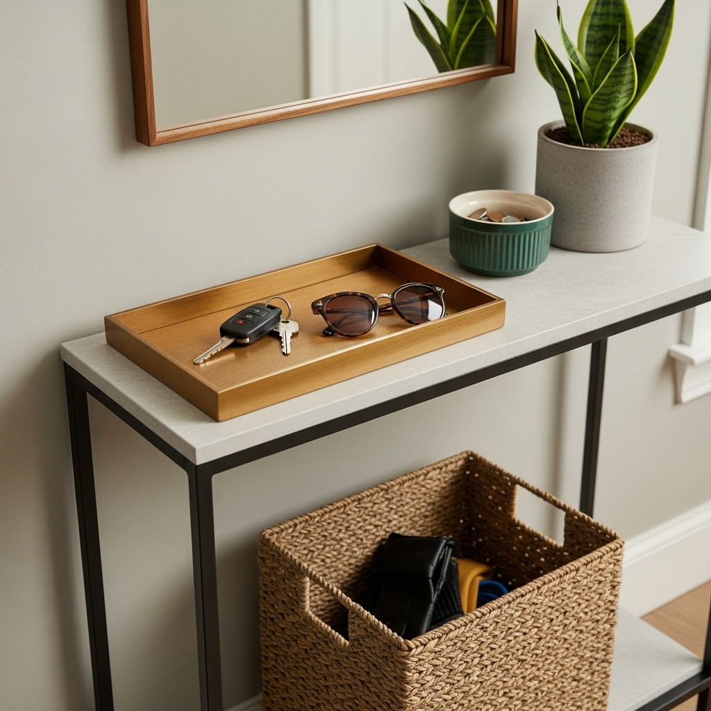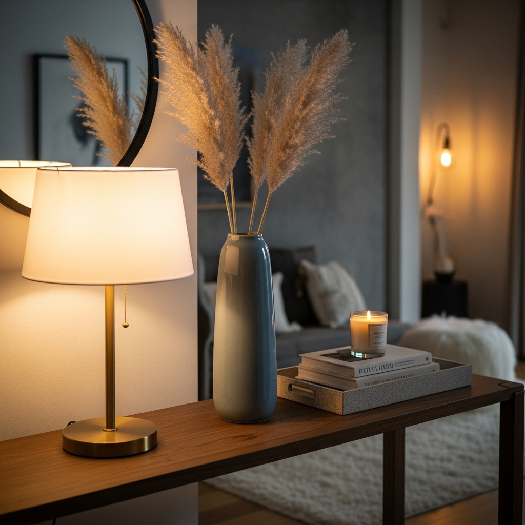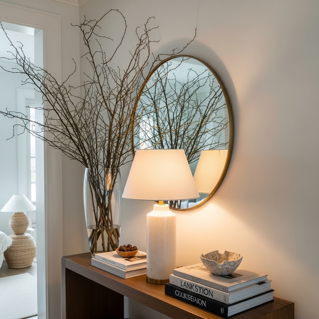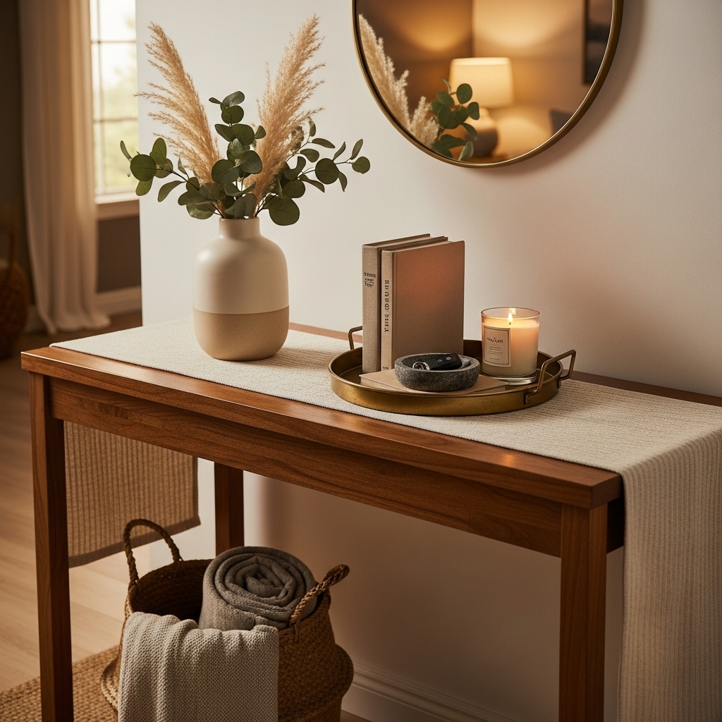 Vary the height of each item to avoid a flat look. This simple method instantly makes your entryway table feel professionally styled.