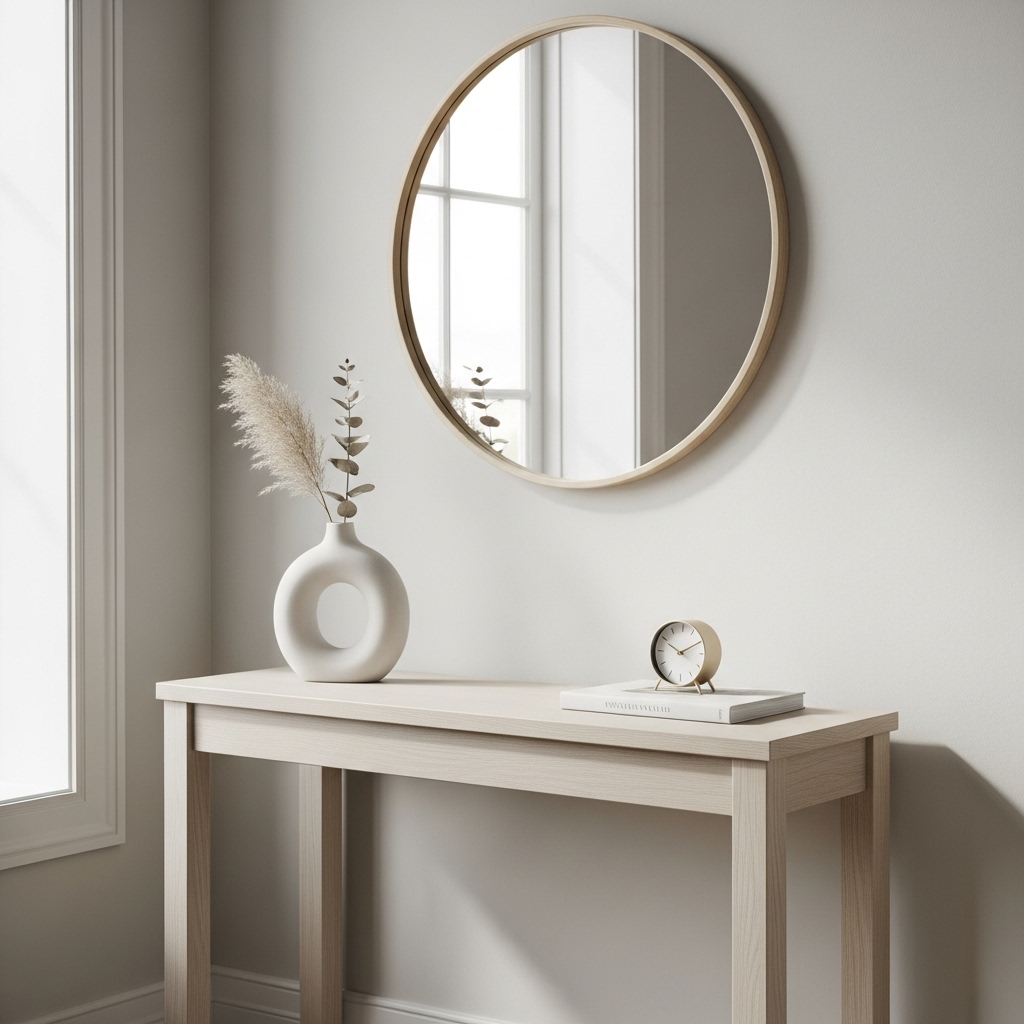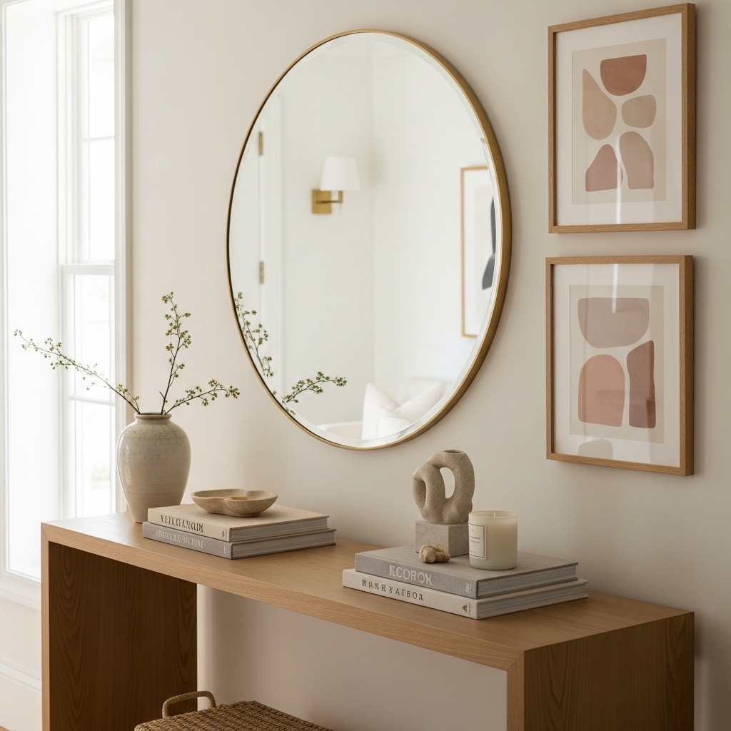 A mirror reflects light, making the space feel brighter and larger. Round mirrors soften the look, while rectangular mirrors feel structured and classic.