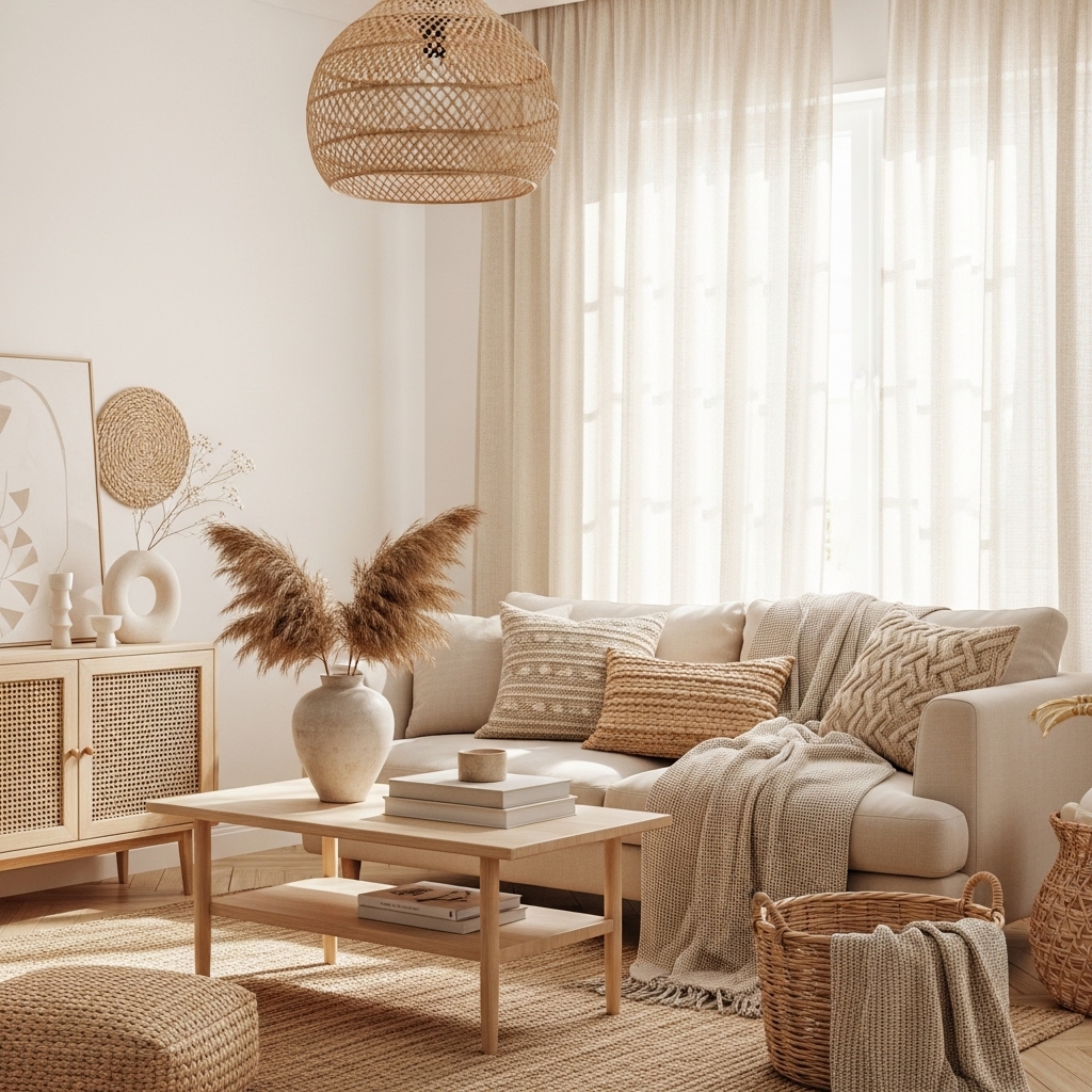 Don’t shy away from natural materials—wood, rattan, stone, and jute all work beautifully in a neutral boho living room or Scandinavian neutral decor scheme. These elements create harmony and warmth, tying your space to nature in a subtle, grounding way.