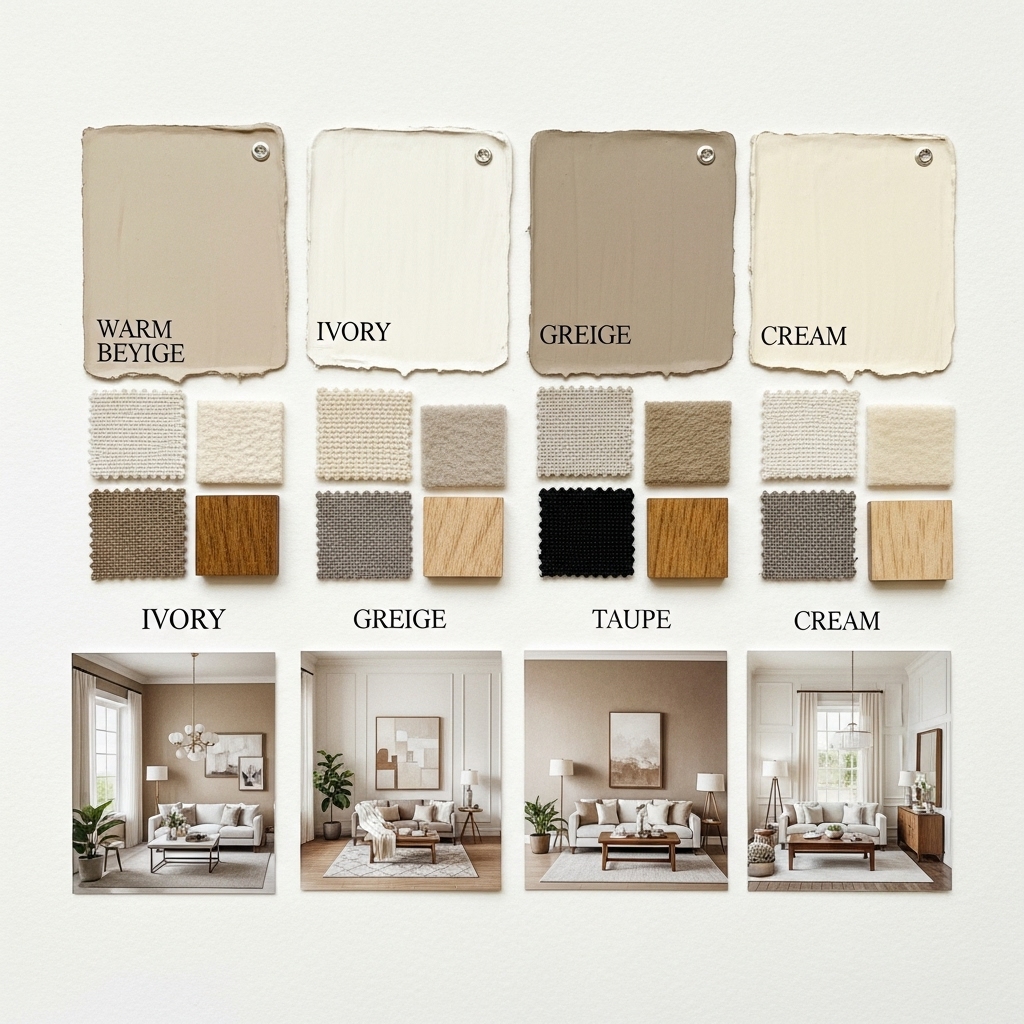 For a layered and balanced aesthetic, mix different tones within the same color family. Combine ivory walls, taupe upholstery, and soft beige throws for a space that feels rich and multidimensional.