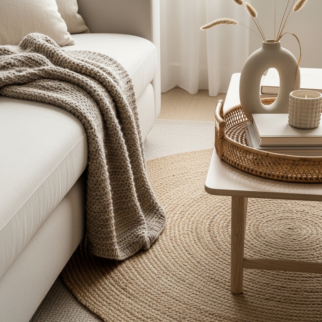 - Add a woven jute rug or textured throw pillows to make the space feel cozy and lived-in.