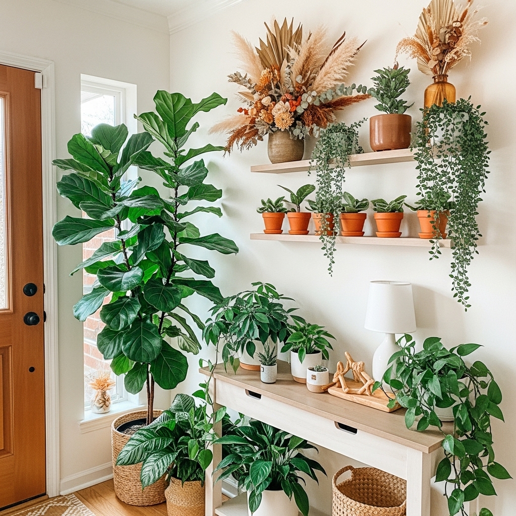 - Small potted plants on shelves or consoles