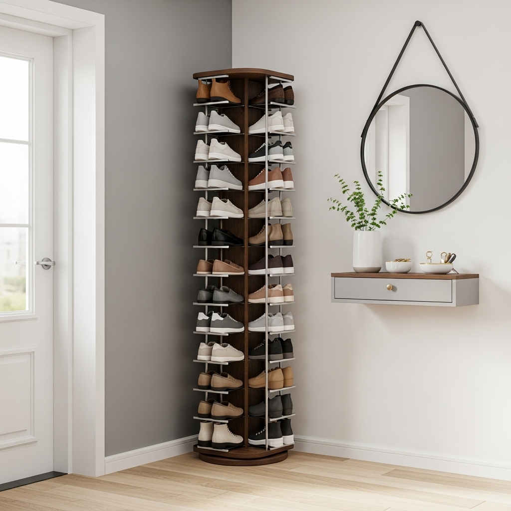 Triangular corner shelves can be mounted from floor to ceiling, giving you vertical storage without blocking movement. Rotating corner towers are another clever solution. These vertical units spin to reveal shoes and accessories while taking up very little floor space.