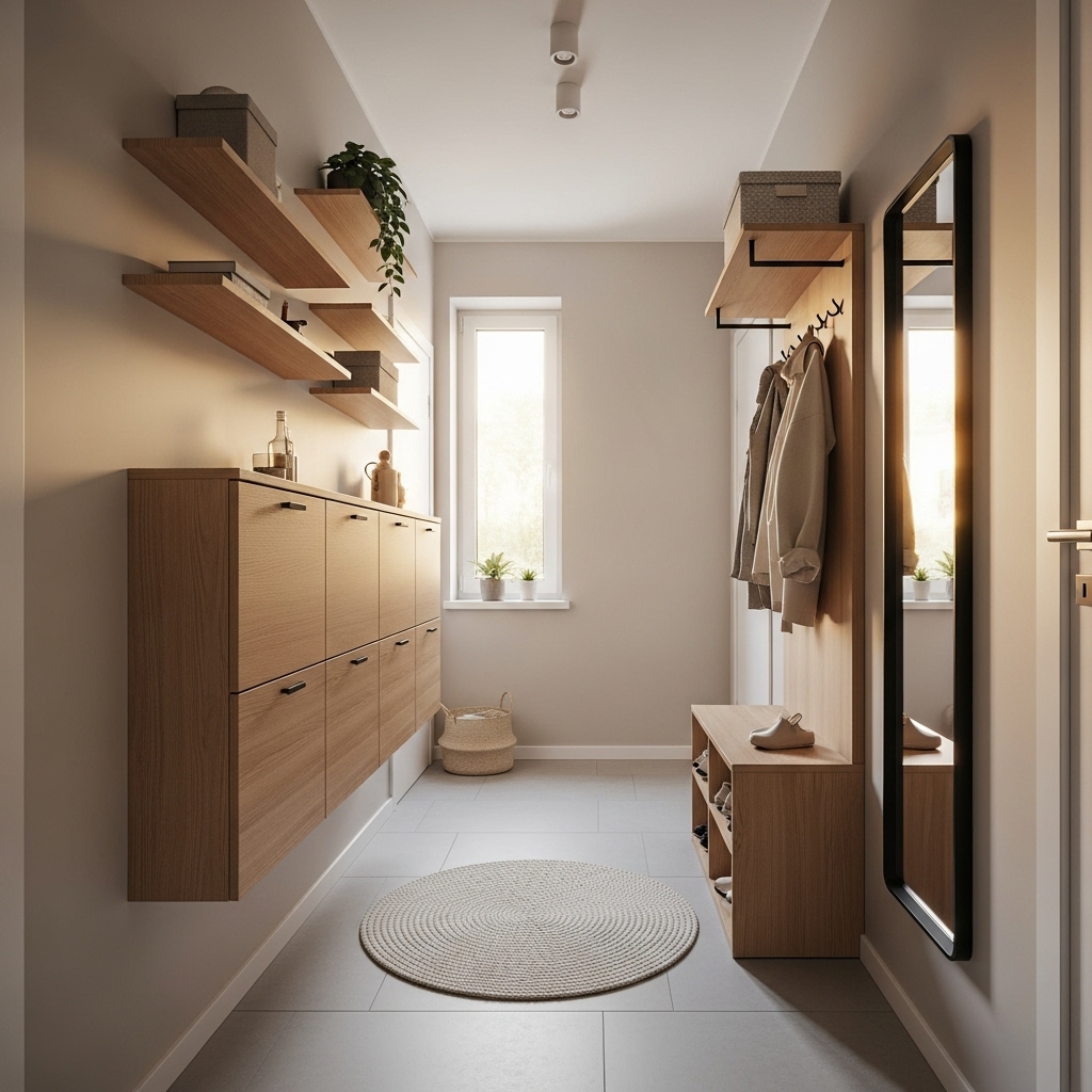 Wall-mounted shoe racks are perfect for narrow hallways or tight entry corners. These racks allow you to store multiple pairs of shoes vertically, freeing up floor space and creating a visually clean layout. Floating shelves are another great option because they add storage while doubling as decorative elements.