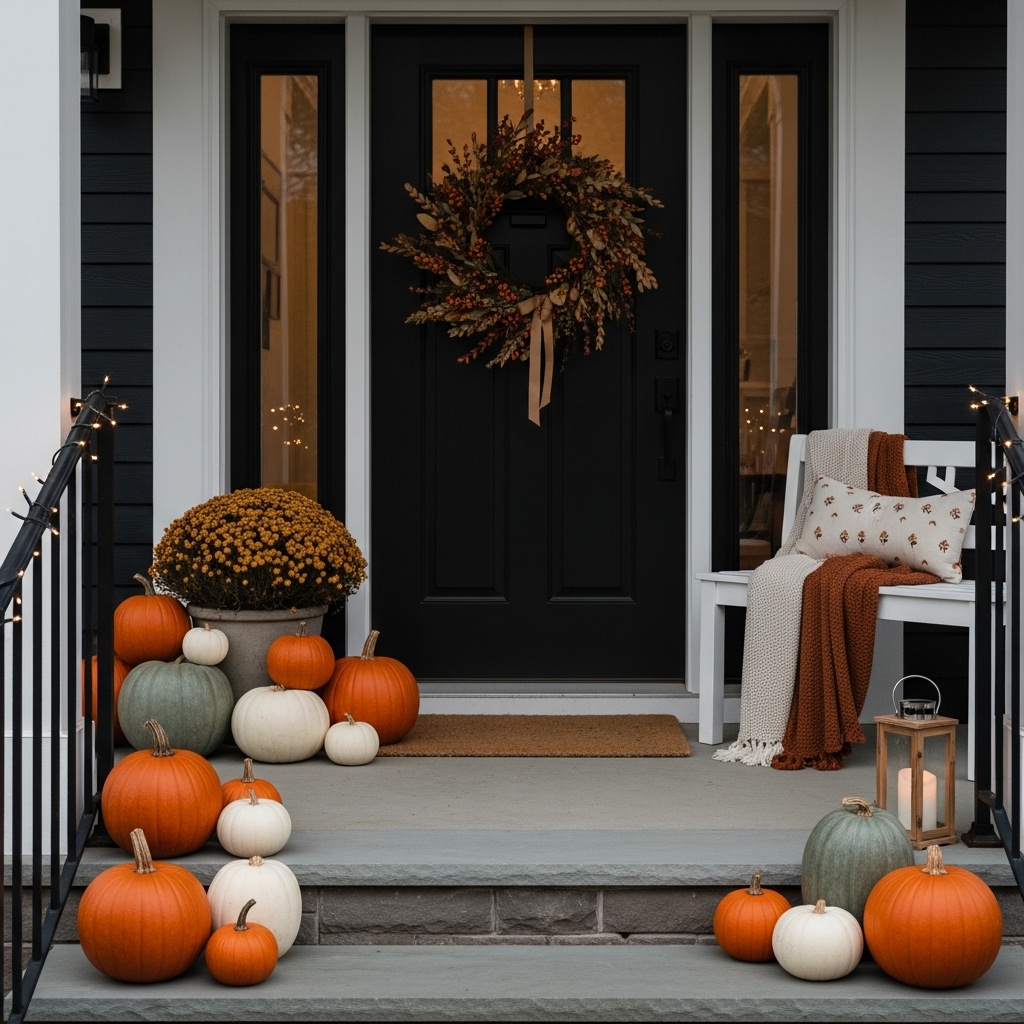 - Fall: Pumpkins, dried leaves, warm-toned pillows, and plaid blankets