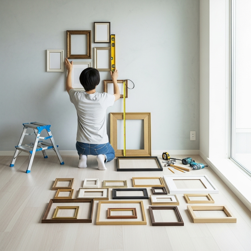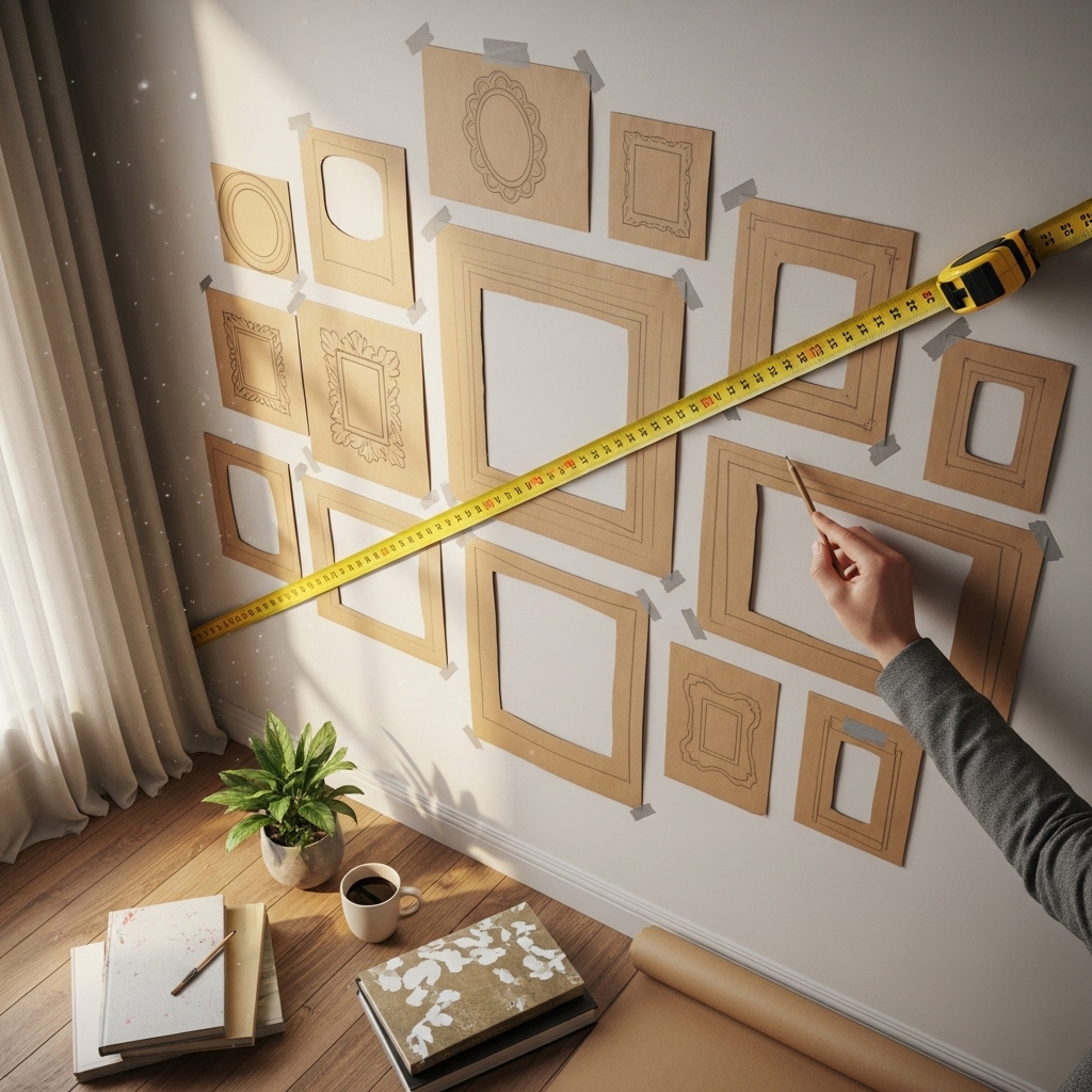 - Mock it up first: On the floor, or trace frames onto kraft paper and tape to the wall.