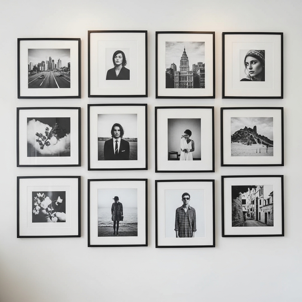 This is a classic, polished option. Use identically sized frames arranged in a neat matrix. It’s orderly, clean, and works beautifully in formal or modern spaces.