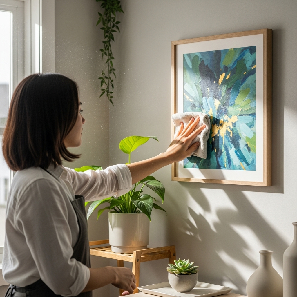 Use frames with sealed backing or plexiglass fronts to protect art. Keep humidity in mind when selecting prints and materials.