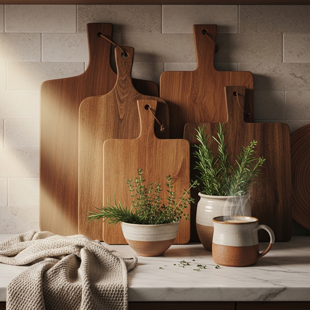 Lean a few wooden cutting boards of varying shapes and sizes against your backsplash. This adds warmth, texture, and a rustic touch.