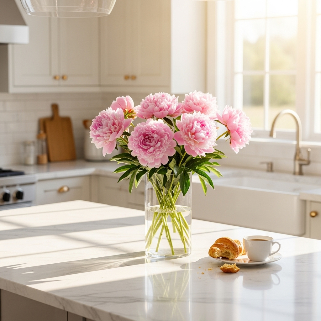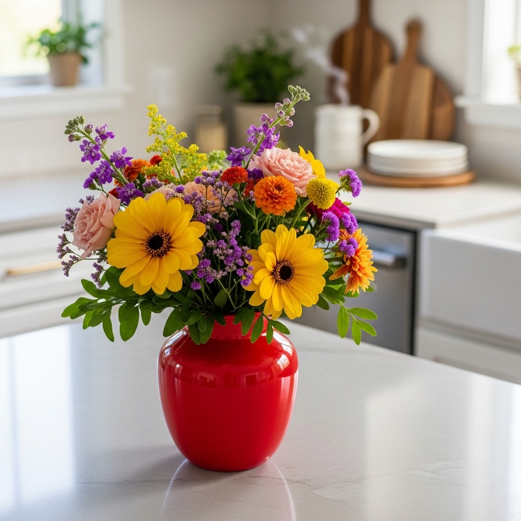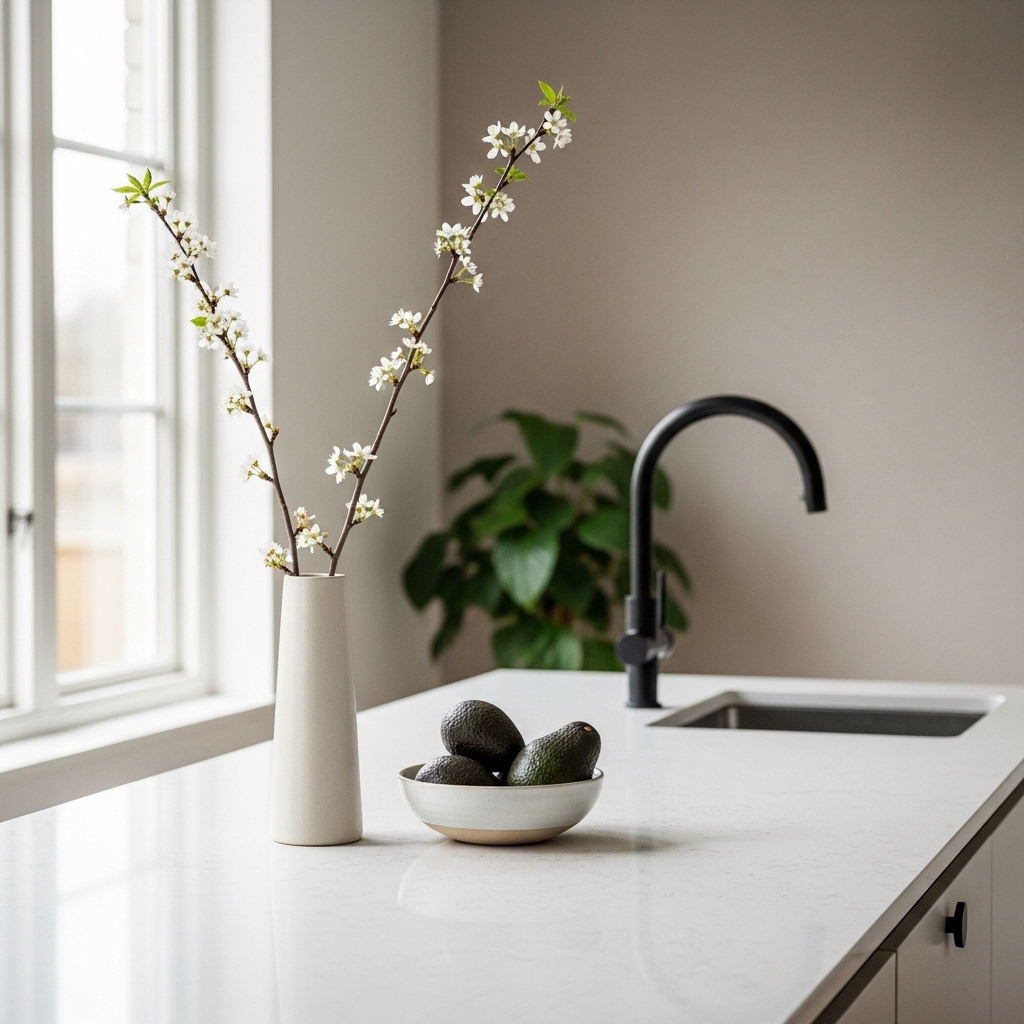 One of the simplest ways to add life and color is with flowers. A tall vase with seasonal blooms instantly refreshes your countertops.