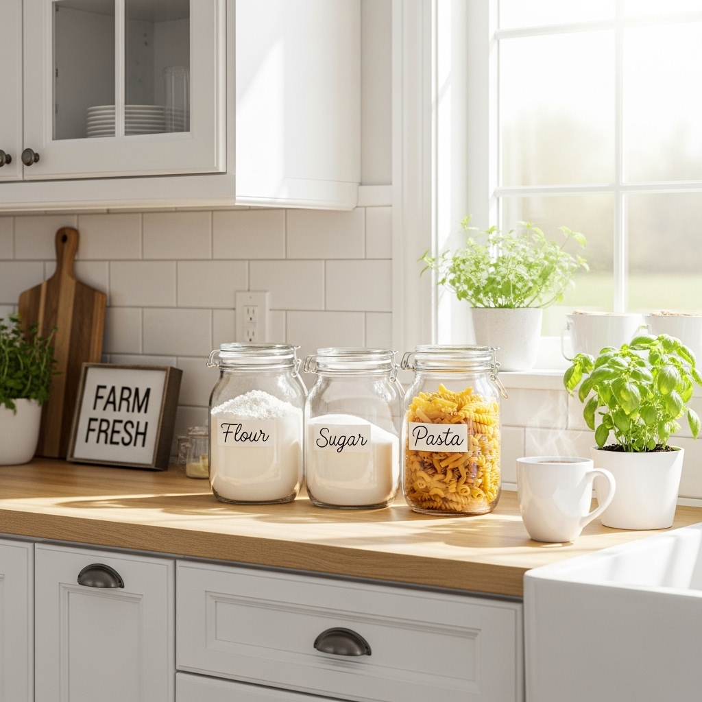 Keep flour, sugar, or pasta in decorative jars. This not only looks charming but also makes your staples easy to reach.