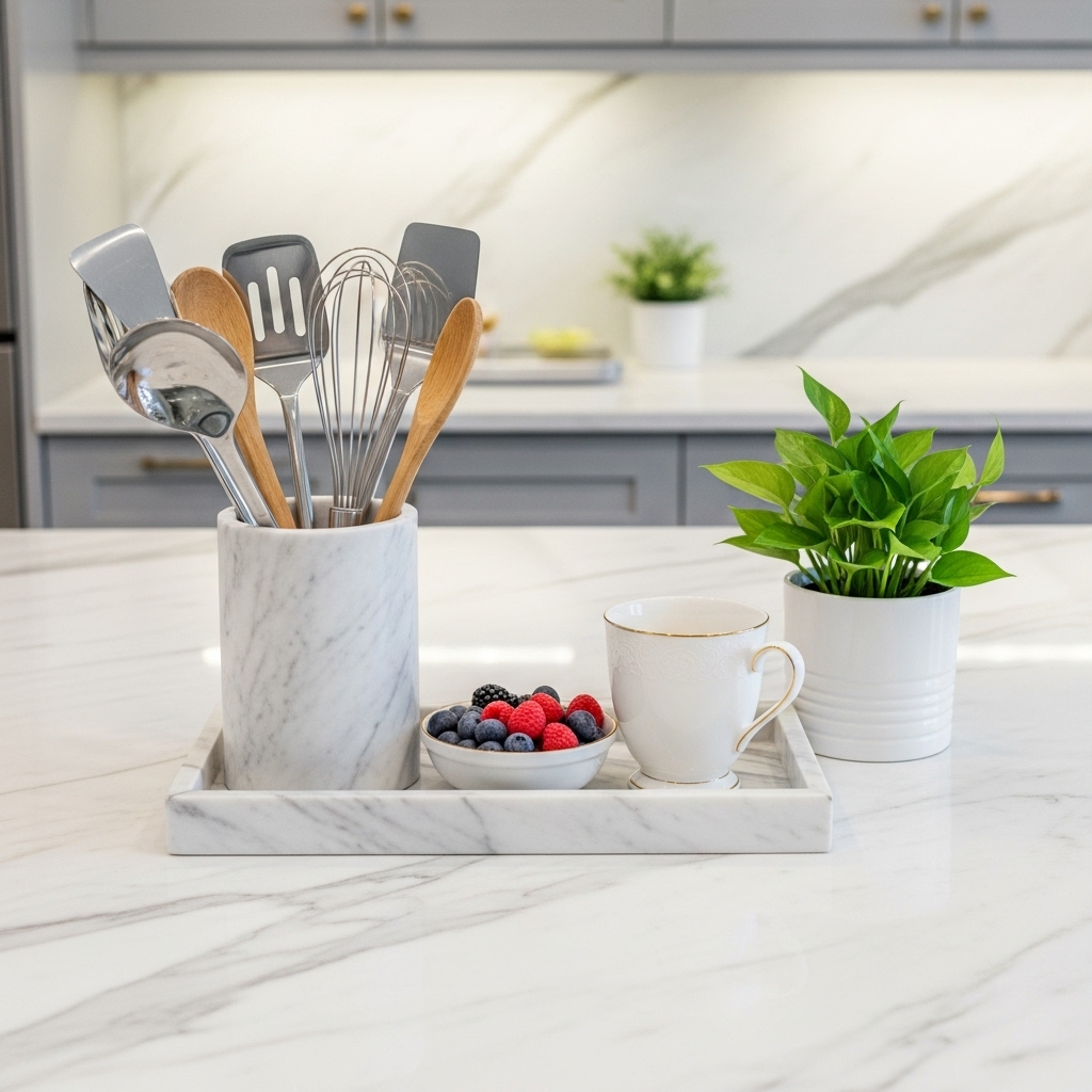 Marble cutting boards, utensil holders, or trays bring sophistication and pair beautifully with most countertop materials.