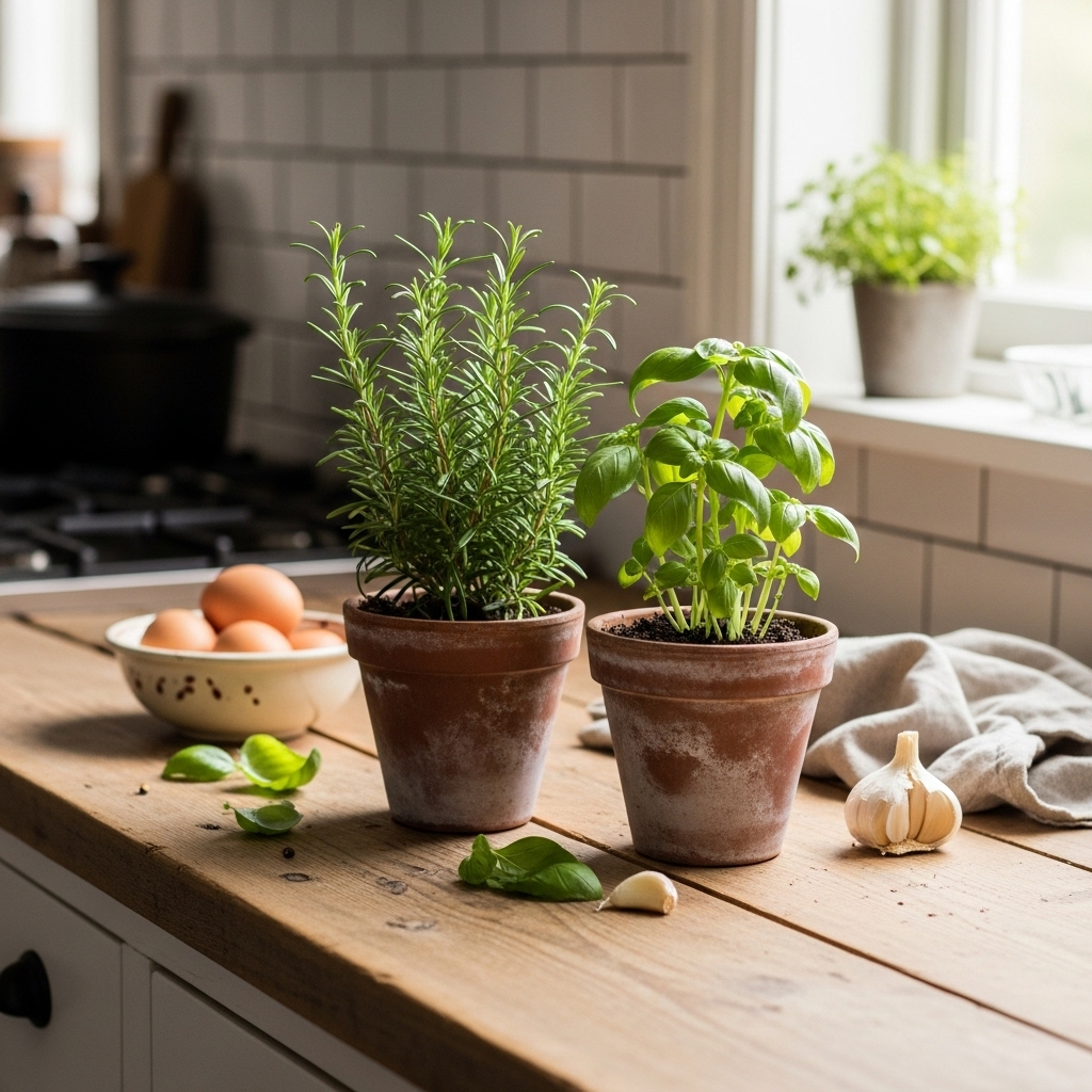 Potted herbs like basil, thyme, or rosemary bring nature indoors and serve a dual purpose—decor and cooking ingredients.