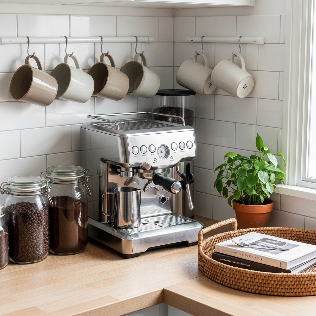 Dedicate a small section to your coffee essentials. A sleek machine, mugs, and a jar of beans can make mornings feel extra special.