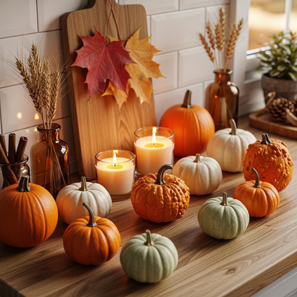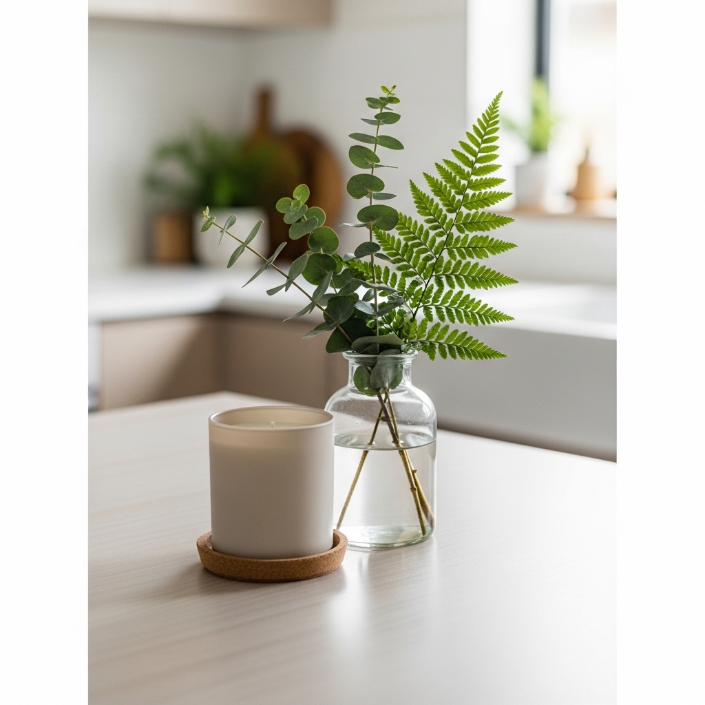 A scented candle in a neutral vessel adds coziness and a subtle fragrance that ties the kitchen together.