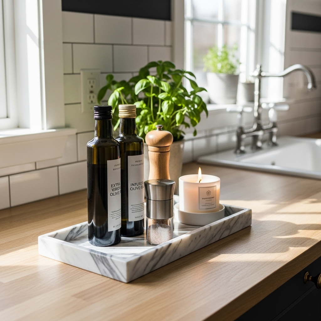 A tray can make everyday items look intentional. Style a wooden or marble tray with olive oil bottles, salt shakers, and a candle to create a tidy focal point.