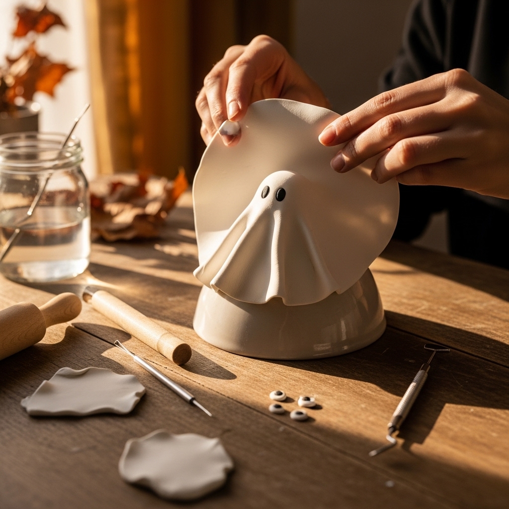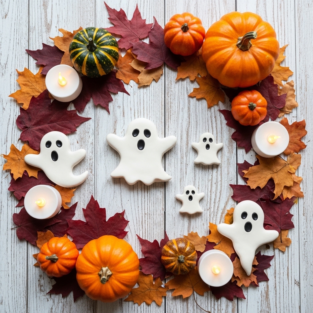 Combine two classic Halloween icons by draping your ghost clay form over a small real or artificial pumpkin. Once dried, you’ll have a ghost that looks like it’s haunting a pumpkin—a perfect centerpiece idea for your Halloween table.