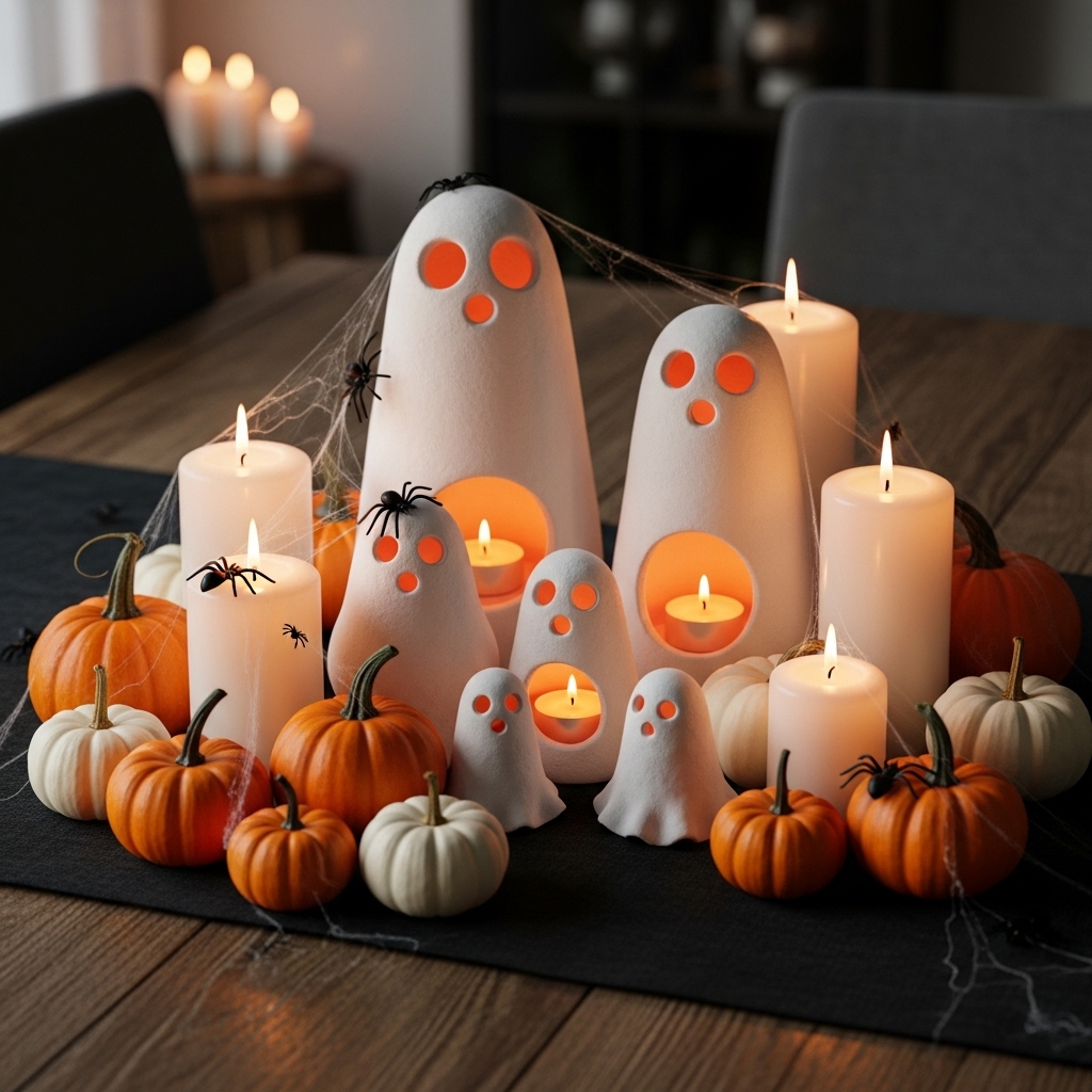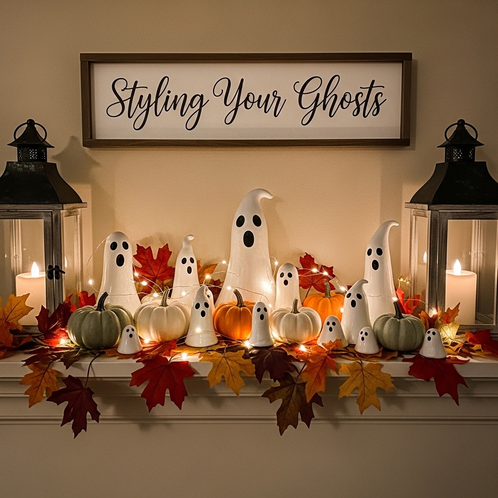 - Mantel Magic: Pair ghost figurines with dried leaves, bats, and rustic lanterns for a cozy haunted-house vibe.