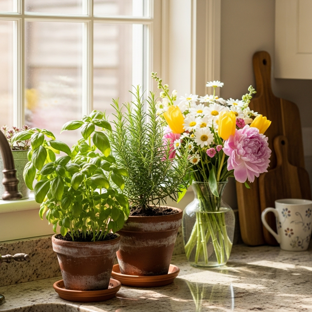 Plants breathe life into any kitchen. Even one small potted herb or a vase of fresh flowers can completely change the vibe of your countertop. Greenery softens hard lines and introduces natural texture.