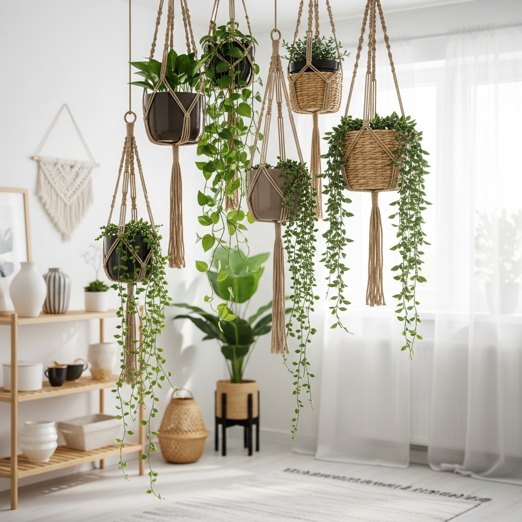Macramé hangers, minimalist hooks, or ceiling rails allow you to customize height and spacing while keeping your space open and airy.