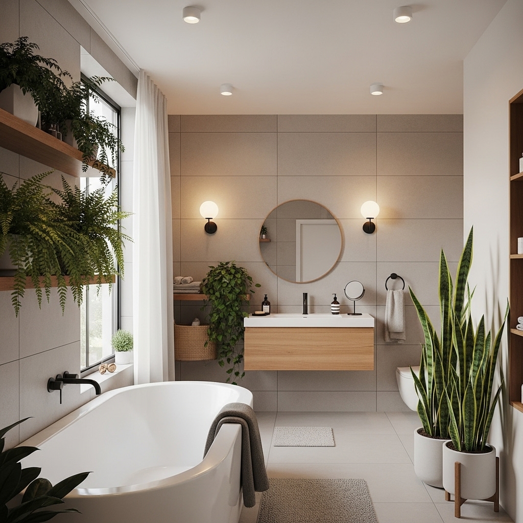A single shelf or hanging planter can transform a small bathroom into a calming, spa-inspired retreat.