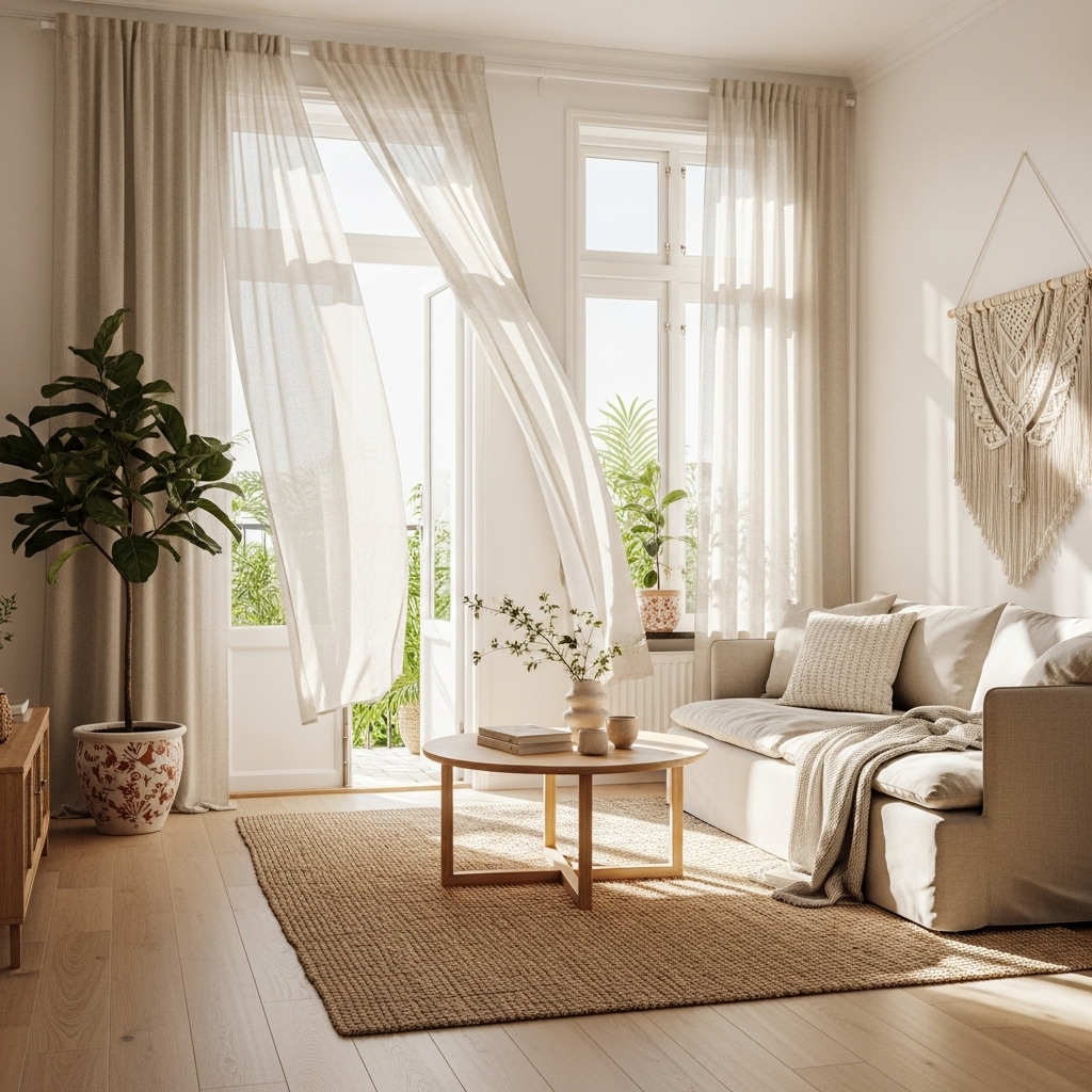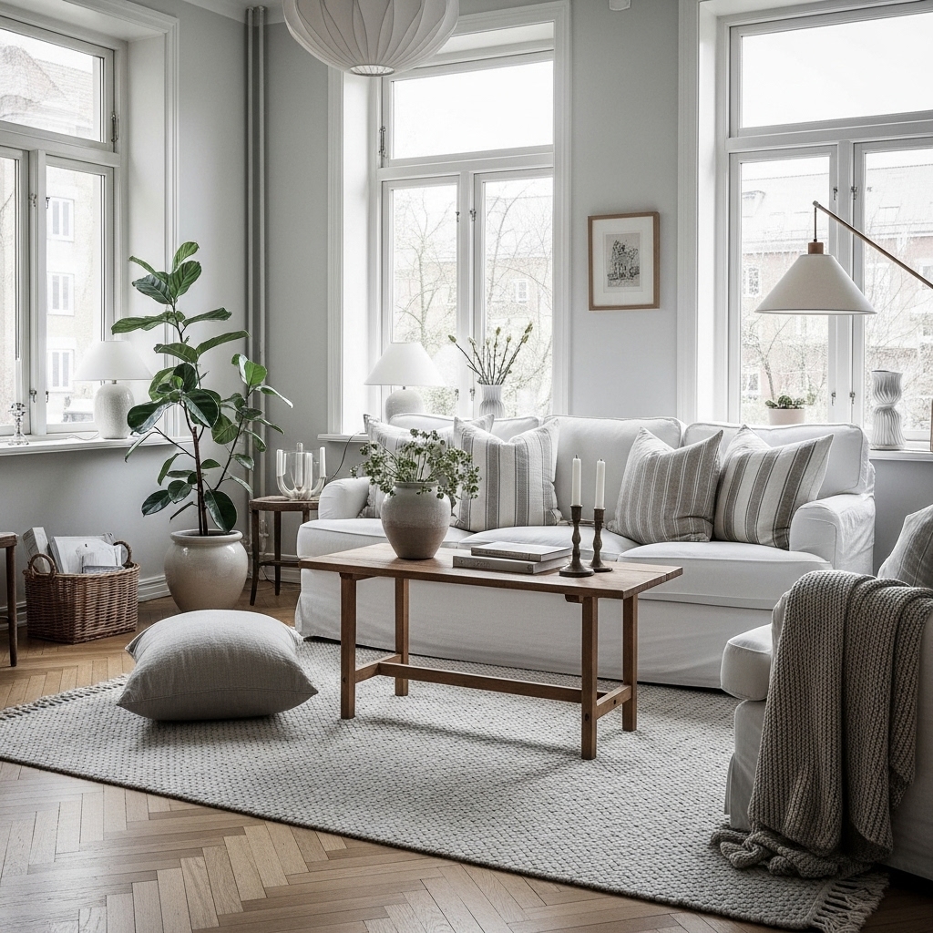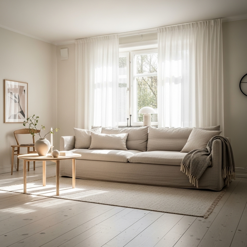 Opt for natural materials like light oak floors or whitewashed wood. These textures ground your space while maintaining that breezy, weightless look. A linen sofa or a slipcovered couch in off-white or light sand tones adds the perfect cozy touch.