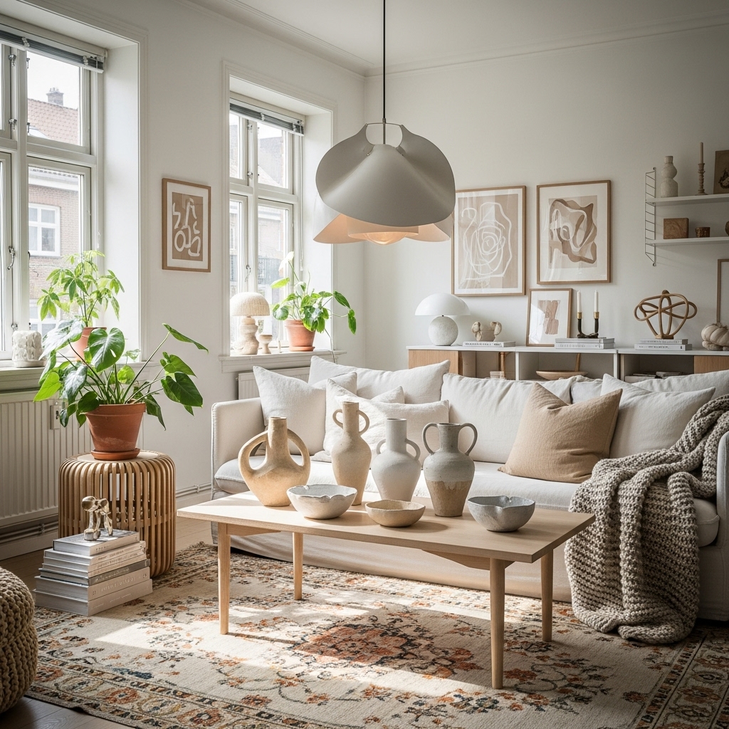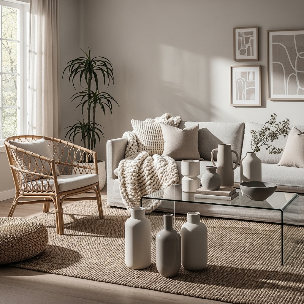 Decor in a light neutral living room should feel intentional and uncluttered. Choose a few statement pieces that complement the palette — not overwhelm it.