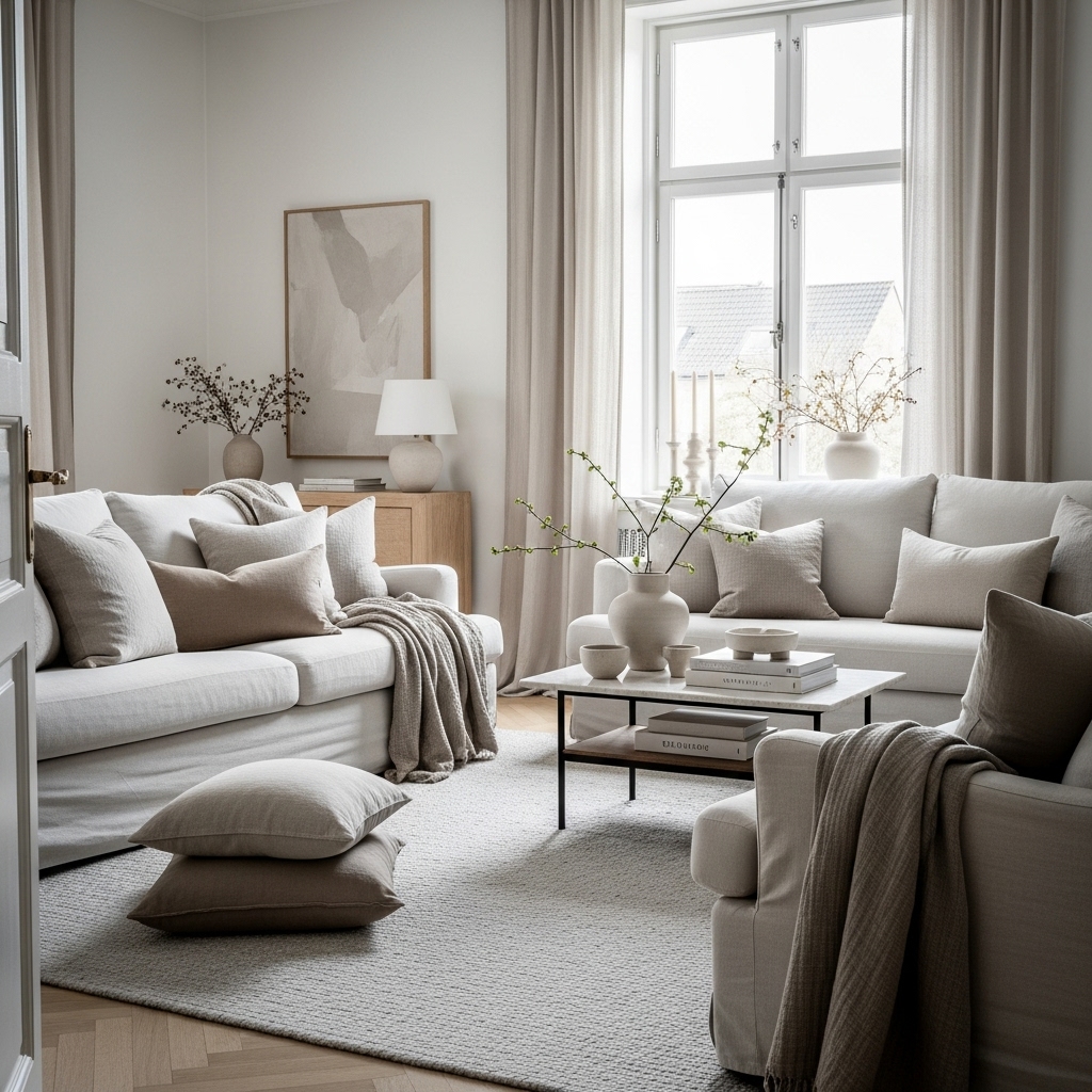 - Throw pillows: A mix of linen white, oatmeal, and subtle patterns