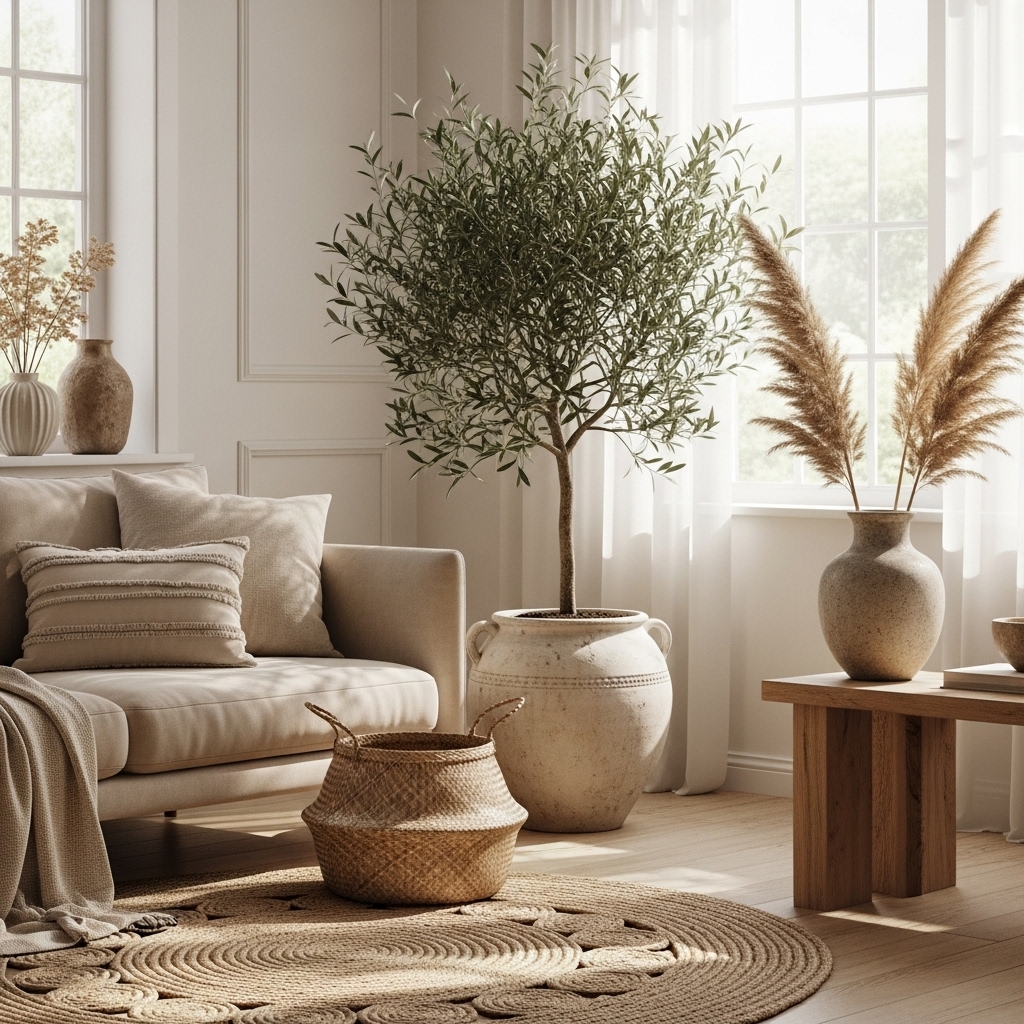 Complement them with natural elements like stone vases, terracotta planters, or woven baskets. These earthy textures add organic warmth and make your space feel more inviting.