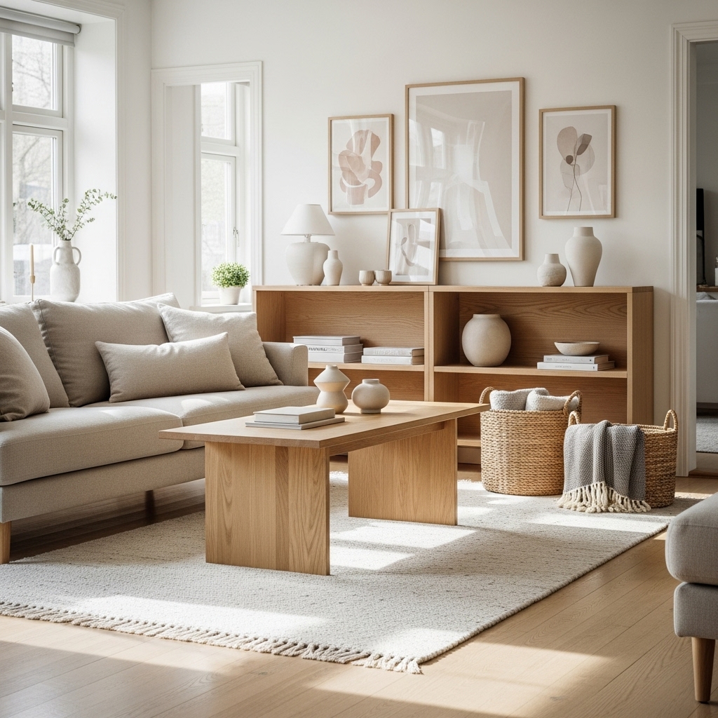 Wood accents are essential for balancing the coolness of neutral shades. Light oak, ash, maple, or birch tones bring warmth and nature-inspired beauty to your living room.