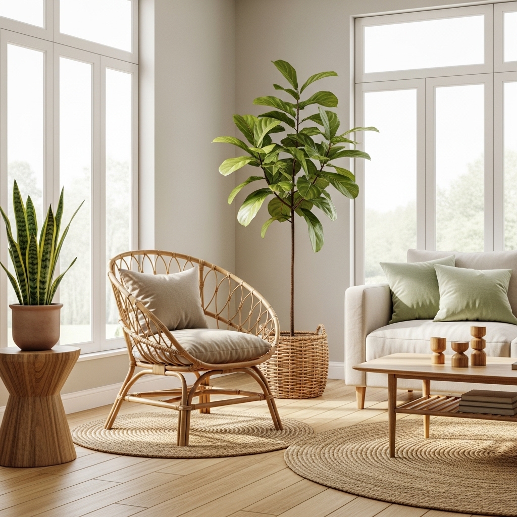 Opt for low-maintenance indoor plants such as snake plants, pothos, or fiddle-leaf figs. You can also use natural materials like rattan, bamboo, and wood in your furniture or decor.