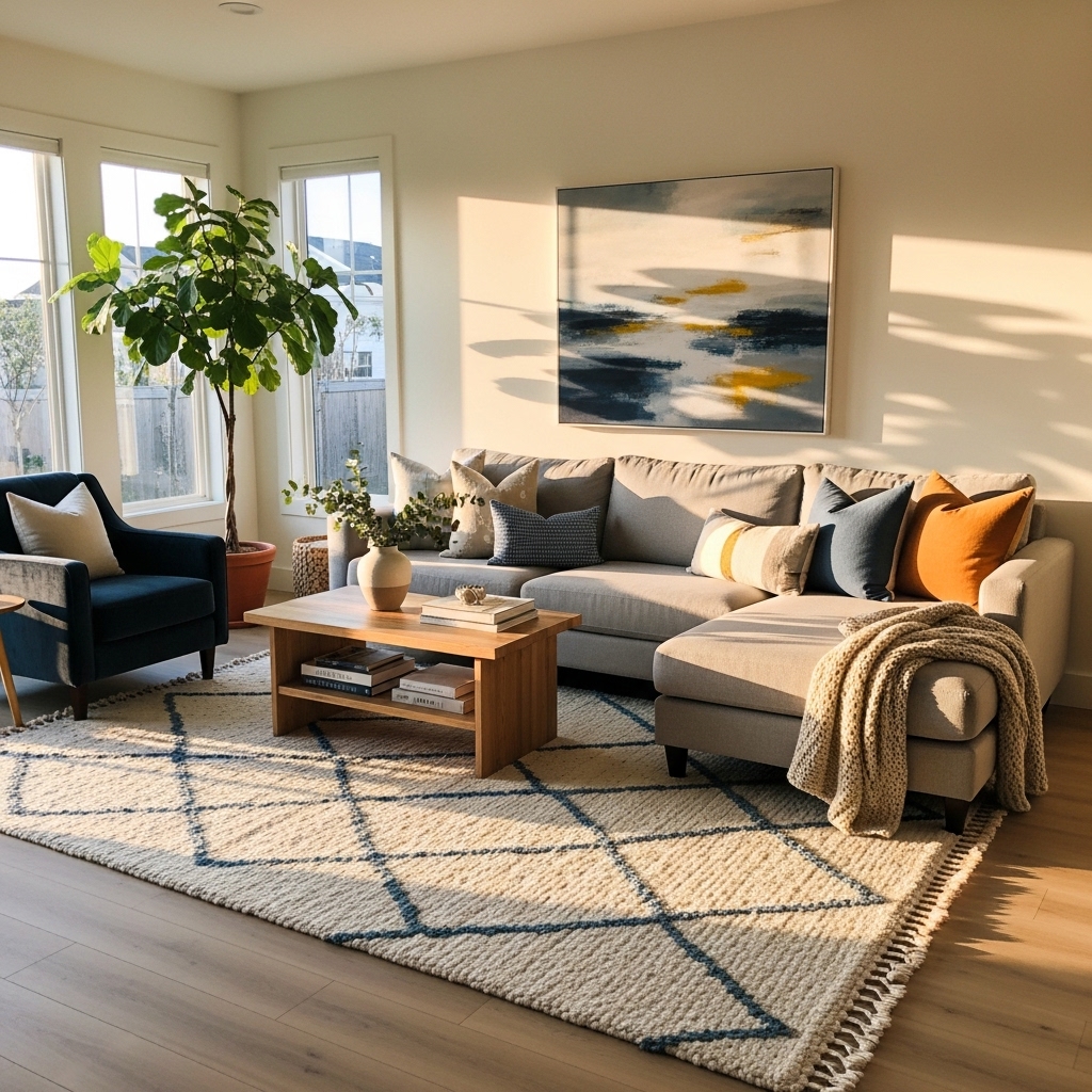 A rug helps define the seating area and adds warmth underfoot. Choose a size that anchors all main furniture pieces (at least the front legs of your sofa and chairs should touch it).