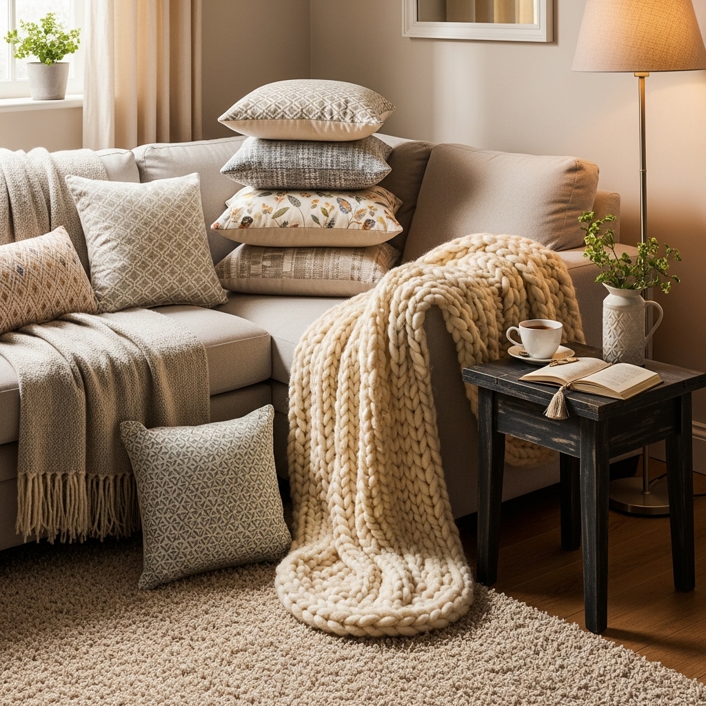 Textiles bring softness and warmth to your living room. Think throw blankets, cushions, and area rugs in varying textures and patterns.