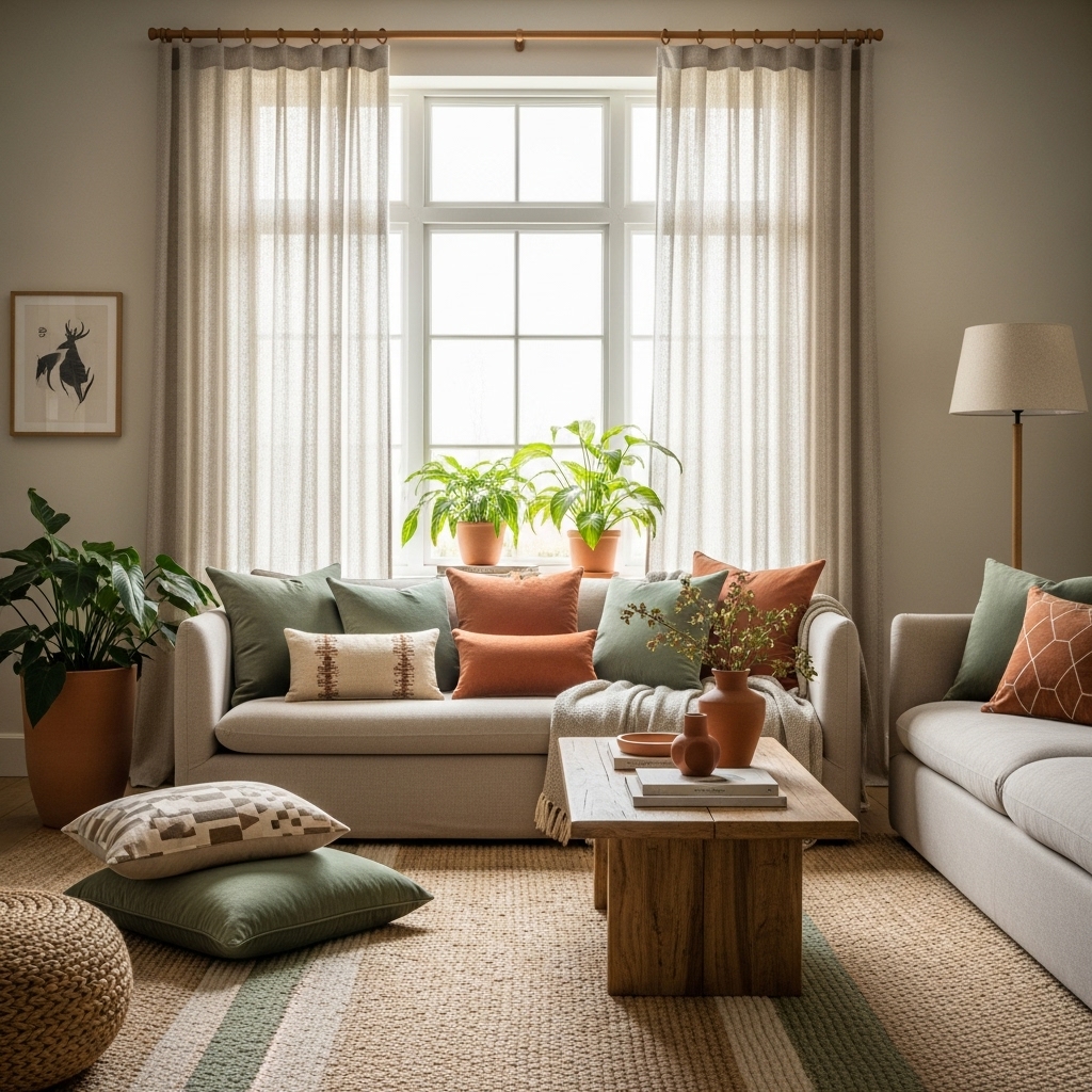 Layering fabrics is key — for example, a chunky knit blanket draped over a linen sofa adds dimension and comfort. Don’t be afraid to mix patterns, but keep them within a consistent color scheme to avoid visual clutter.