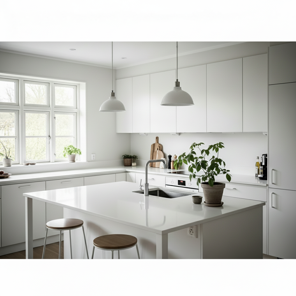 For example, a white counter with light wood accessories and matte black accents feels modern yet cozy.