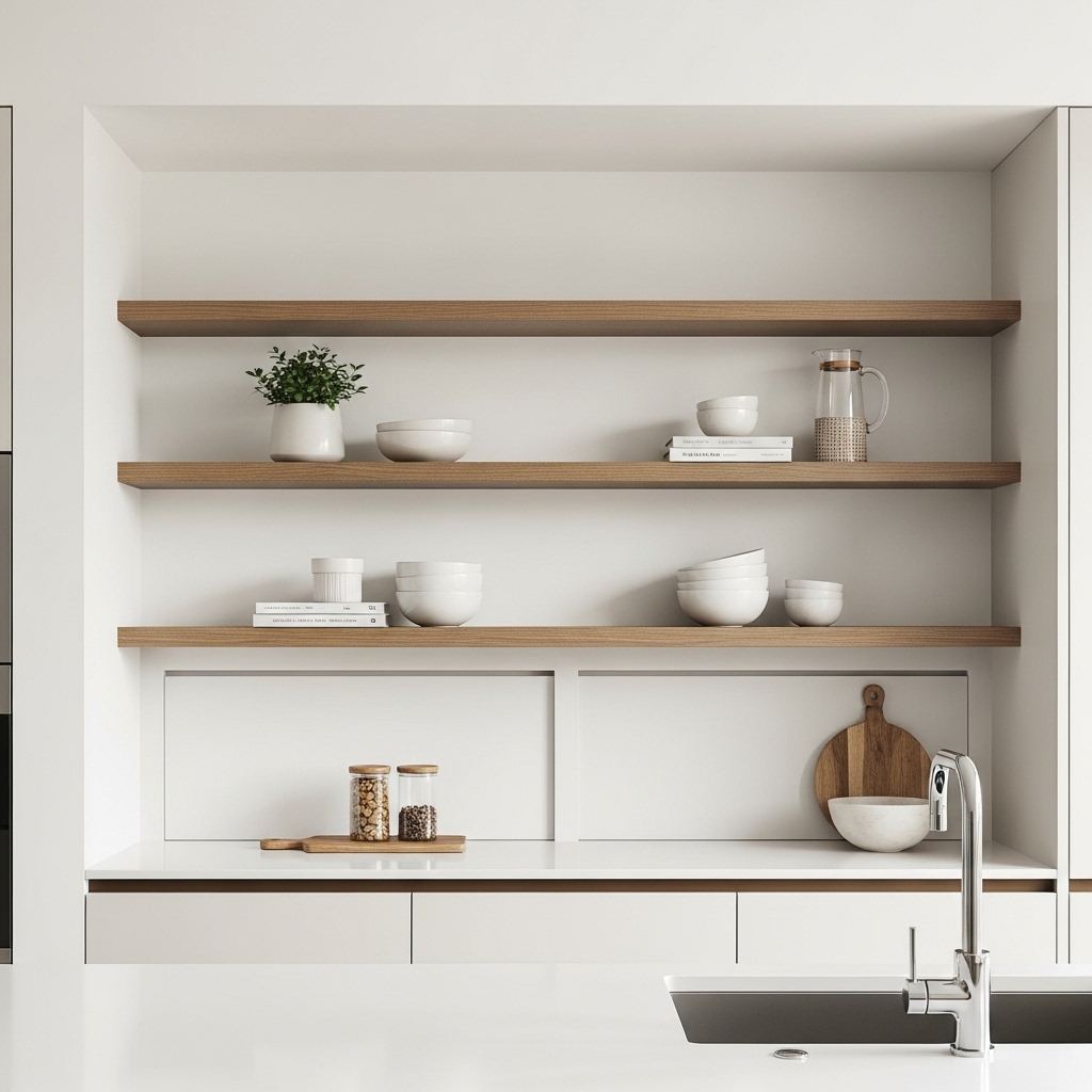 - Open shelves with minimal styling