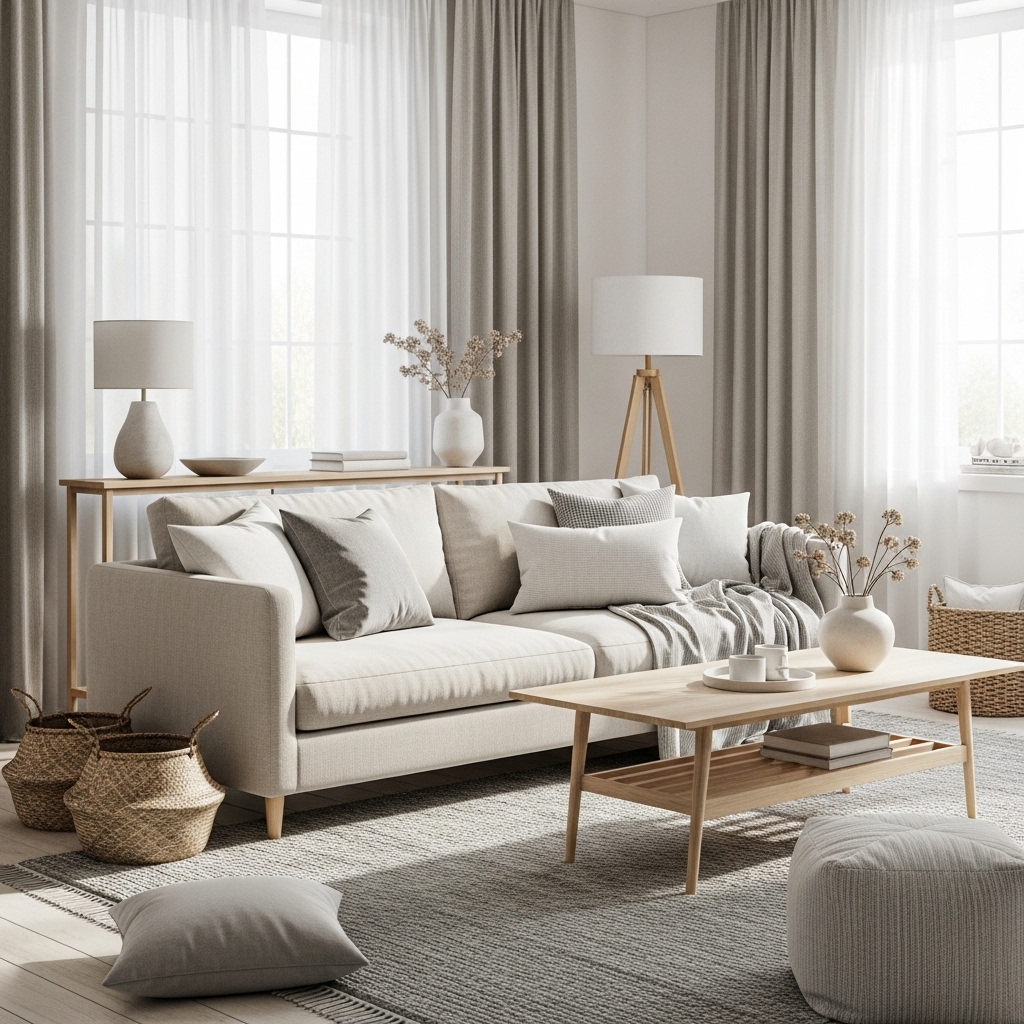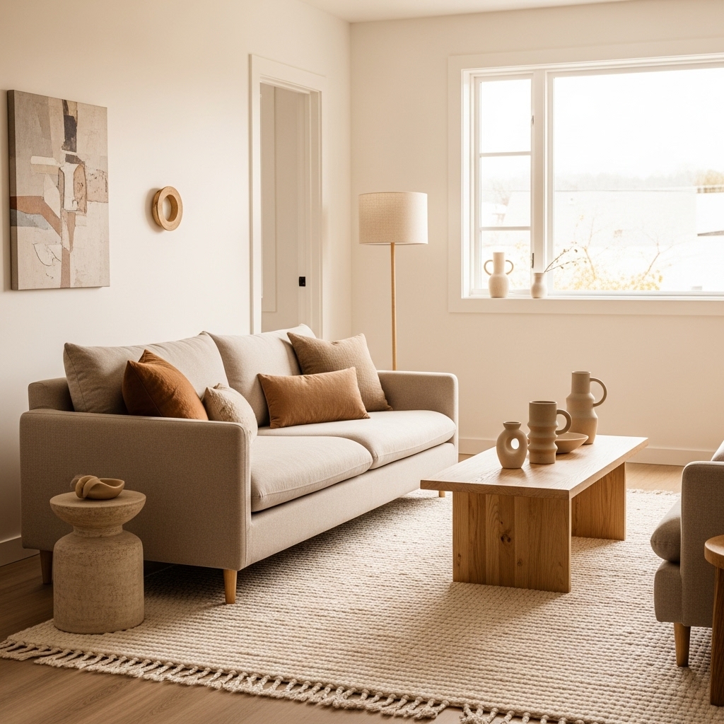 A wooden coffee table, a jute rug, or ceramic décor pieces bring organic texture without visual clutter. Even a small touch—like a wood tray or clay bowl—can make the room feel grounded and serene.