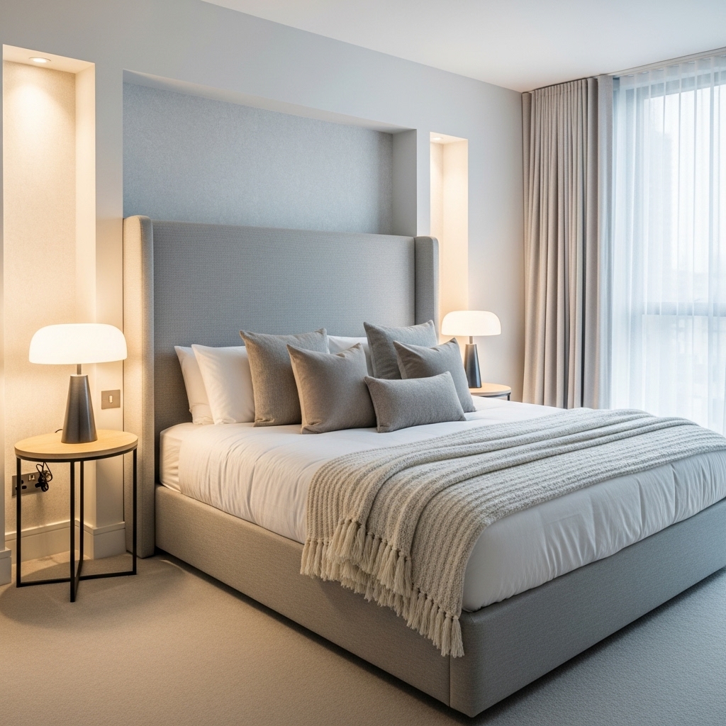 For a chic modern look, consider using crisp white or soft neutral bedding paired with textured accents. This creates a calm, serene feel that mimics high-end boutique hotels.