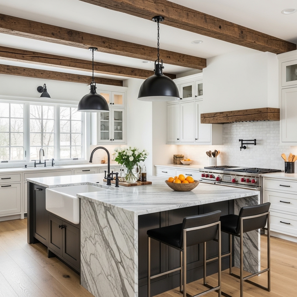 Quartz, marble, and butcher block are popular options. Quartz offers durability and a sleek finish, while butcher block adds warmth and character. If you love the rustic feel, mix materials — for instance, quartz counters with a wooden island top.
