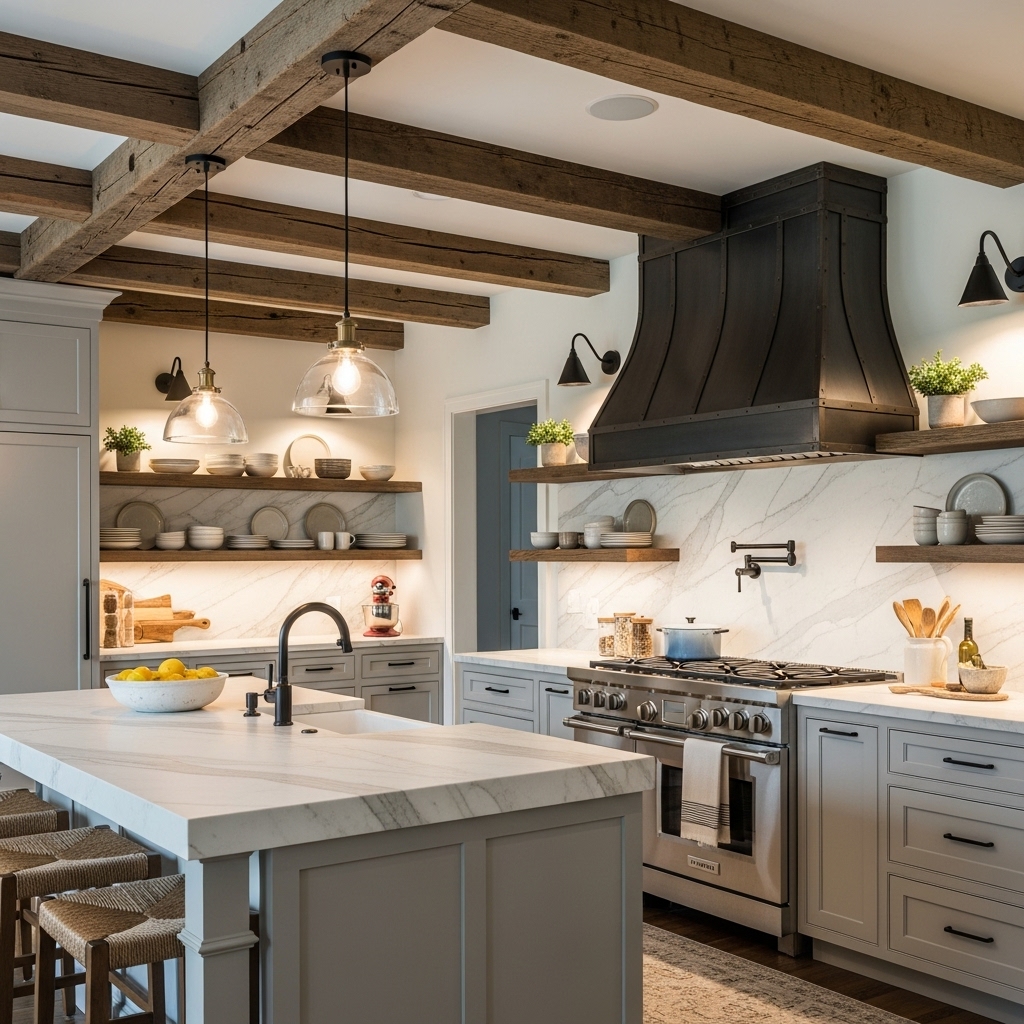 Details like exposed beams, sliding barn doors, or vintage-inspired stools bring in that authentic farmhouse vibe — without feeling overly “country.”