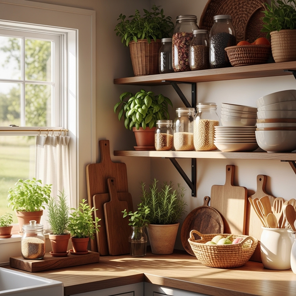 - Display Collections: Use open shelving for curated pieces like stoneware, mason jars, or woven baskets.