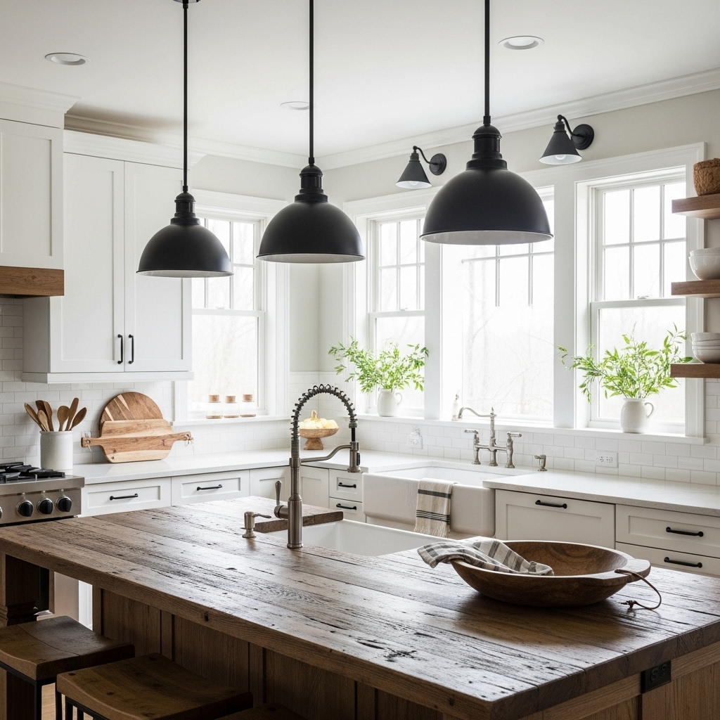 Industrial-style pendant lights, glass globes, or black iron chandeliers are perfect for adding drama. Hang them above the island or dining area to tie the space together.