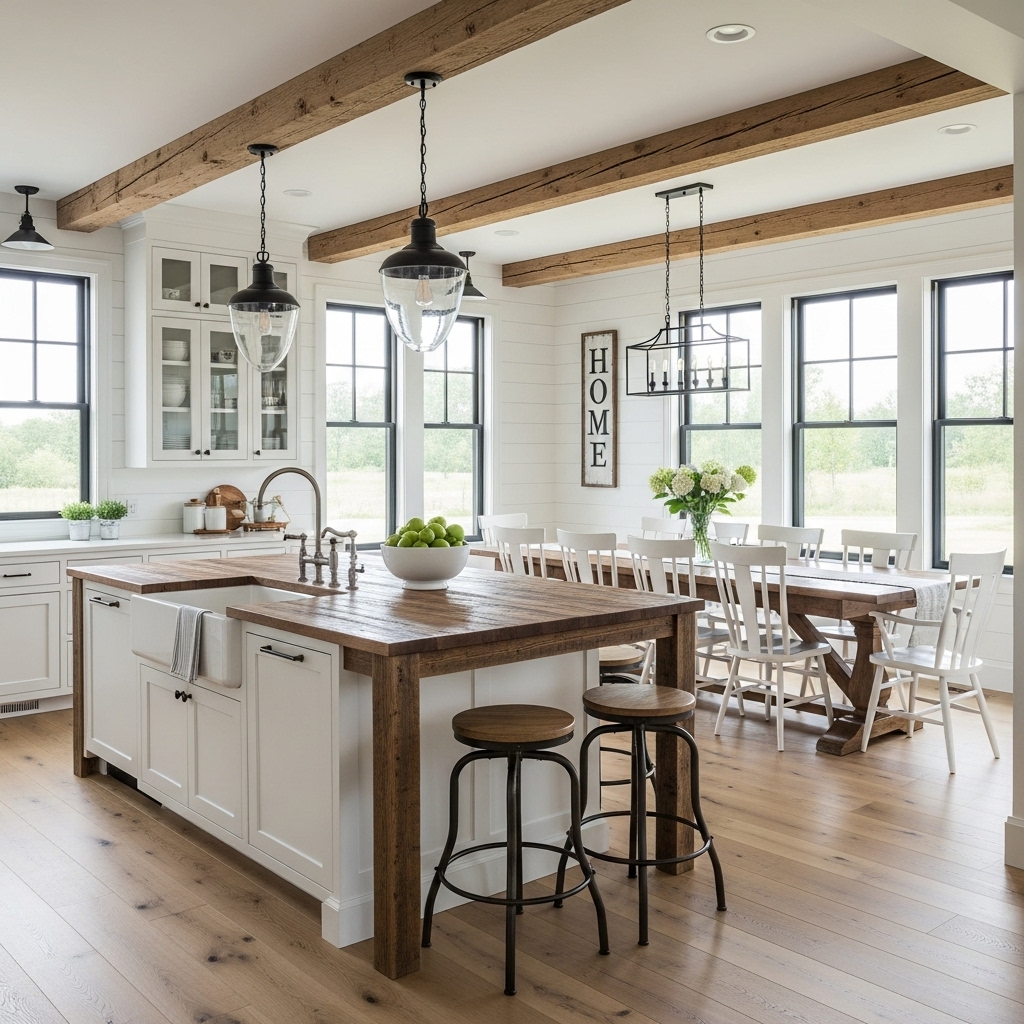- Central Kitchen Island: The island often becomes the star — a gathering spot for meal prep, casual dining, or coffee chats. Choose a design with seating, built-in storage, or even a butcher-block countertop for added farmhouse flair.
