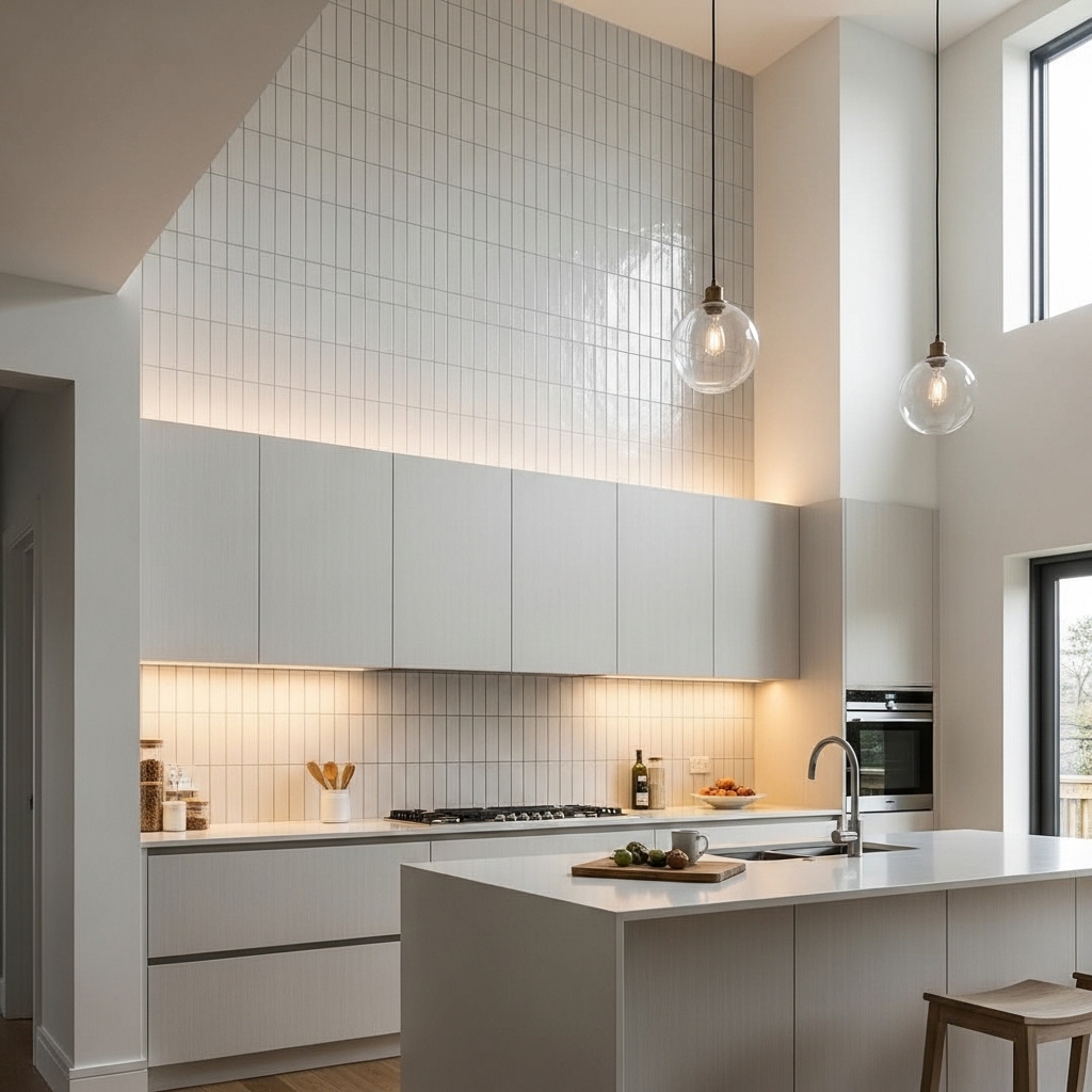 Stacking tiles vertically gives your kitchen a sense of height and modern sophistication. This design is perfect for small kitchens, as it draws the eye upward, making the space feel larger.