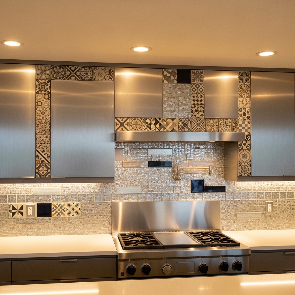 Mixing materials like metal, glass, and tile can create a truly unique backsplash. For example, you could use metallic accents behind the stove and glass tiles near the sink for a dynamic and functional design.