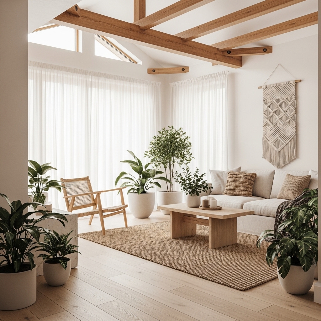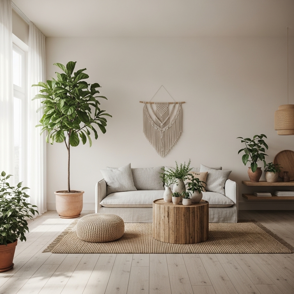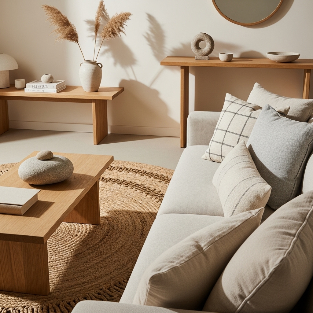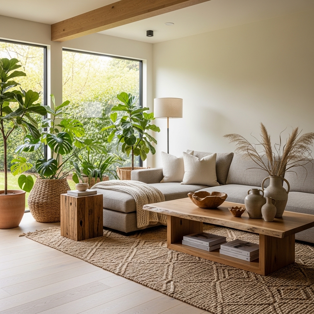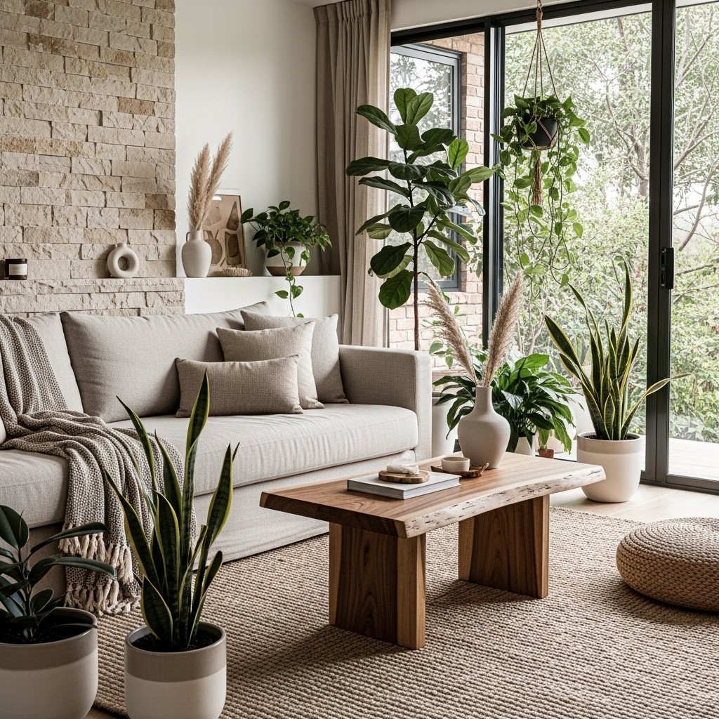 Start with a neutral base — creamy walls, a linen sectional, and a low-profile wooden coffee table. Add texture with a woven jute rug and organic accents like clay vases or pampas grass.
