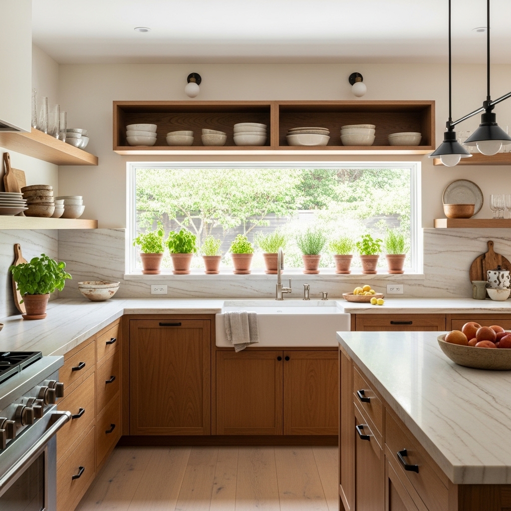 Incorporate greenery — small potted herbs or hanging plants — to bring life to the space. If possible, let natural light flood in through large windows or skylights.