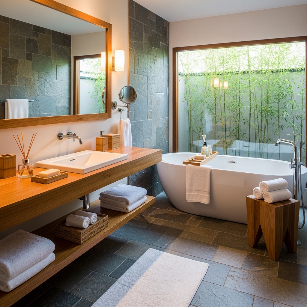 Transform your bathroom into a serene sanctuary using materials like stone, wood, and linen. Earth-toned tiles, minimalist fixtures, and soft lighting create a calming environment. Add natural touches with bamboo accessories or dried floral arrangements.